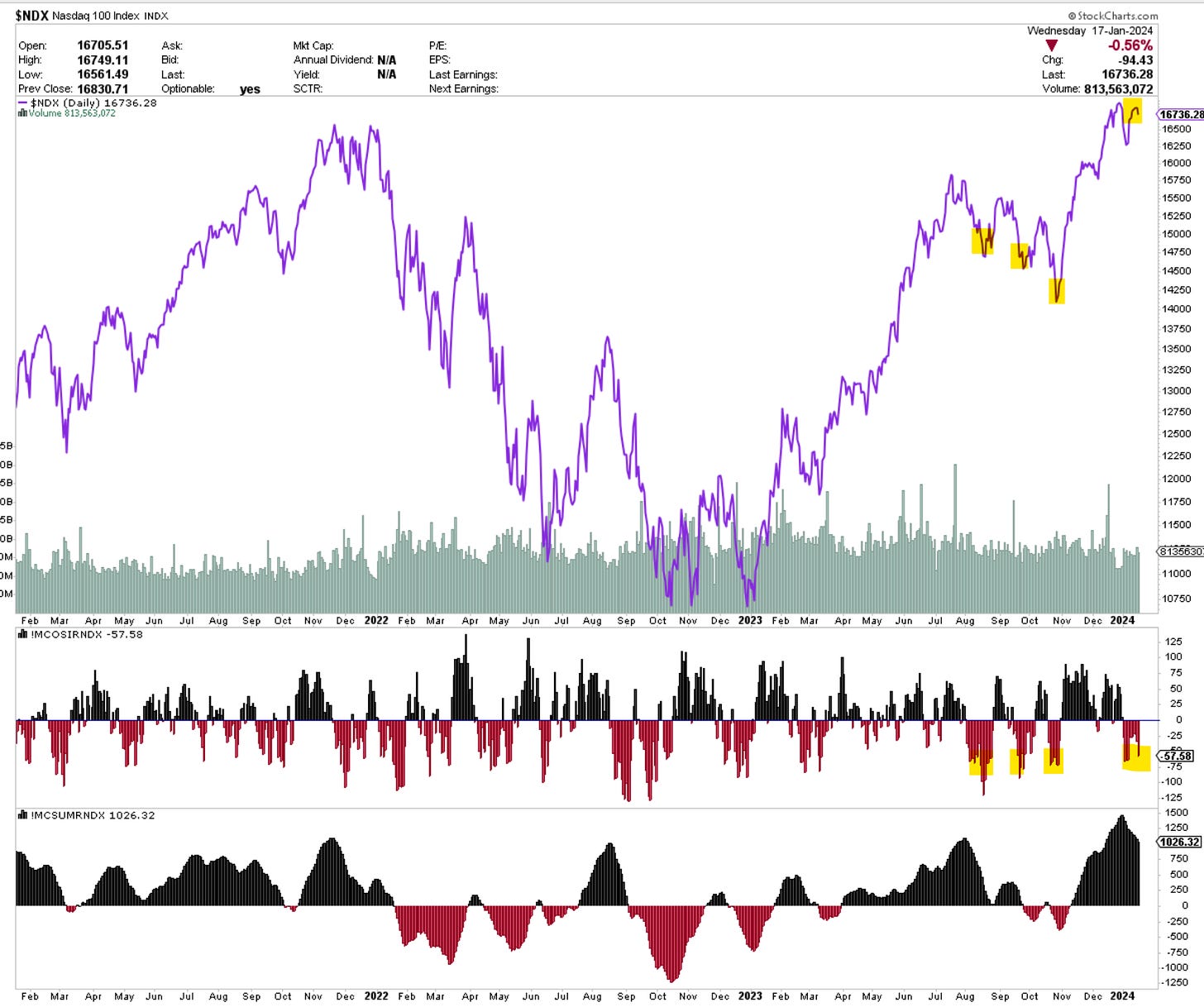 Here is the breadth oscillator for the Nasdaq. In terms of declines outpacing advances, we are almost at the levels from the summer of 2023. Yet price has not really responded. Since NDX is also heavily skewed towards those few large stocks, it continues to hold near the highs. Let’s see if it succumbs to further selling pressure.
