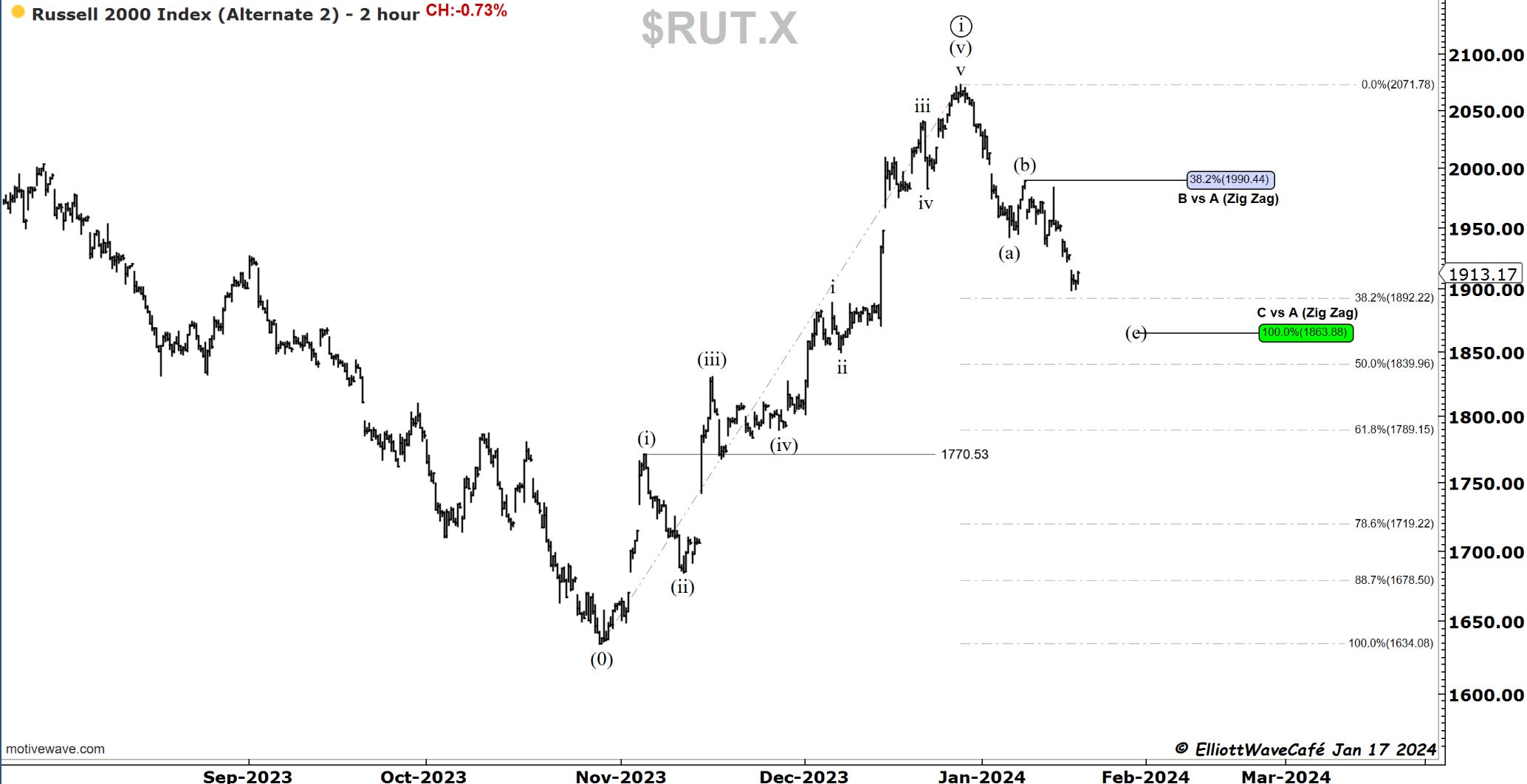 Russell continued lower once again, and it was the weakest of the major indices. We are now at 38.2% fib support. We also have decent horizontal support and a 50-day MA nearby. The RSI is near 40. This confluence of support could provide a temporary hold on this decline. I don’t think that the entire corrective move is completed, however. For those attempting to play a bounce in small caps, I would like to see a clean 5 waves up on smaller time frames. So far, only corrective 3 wave bounces are present.
