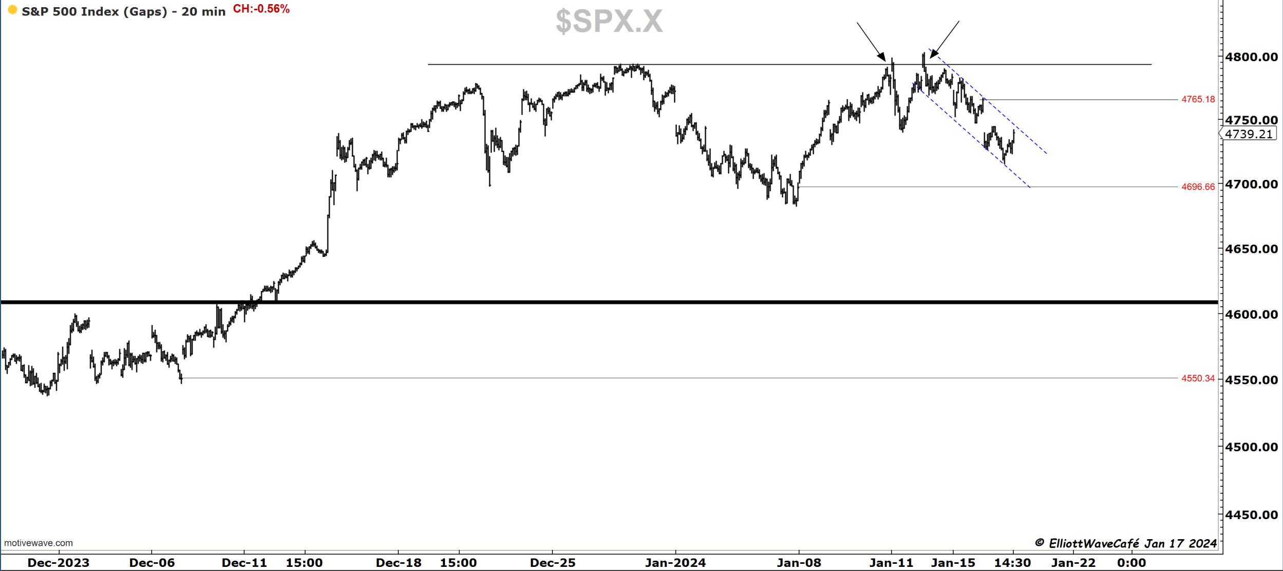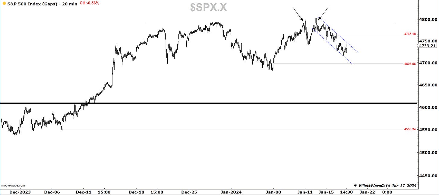 Here is the short-term channel in the SP500 with a series of lower lows and lower highs. You can also notice in red few unfilled gaps that live nearby. The large black line is the targeted support at 4600. The 2 arrows show price failures on breakout attempts.