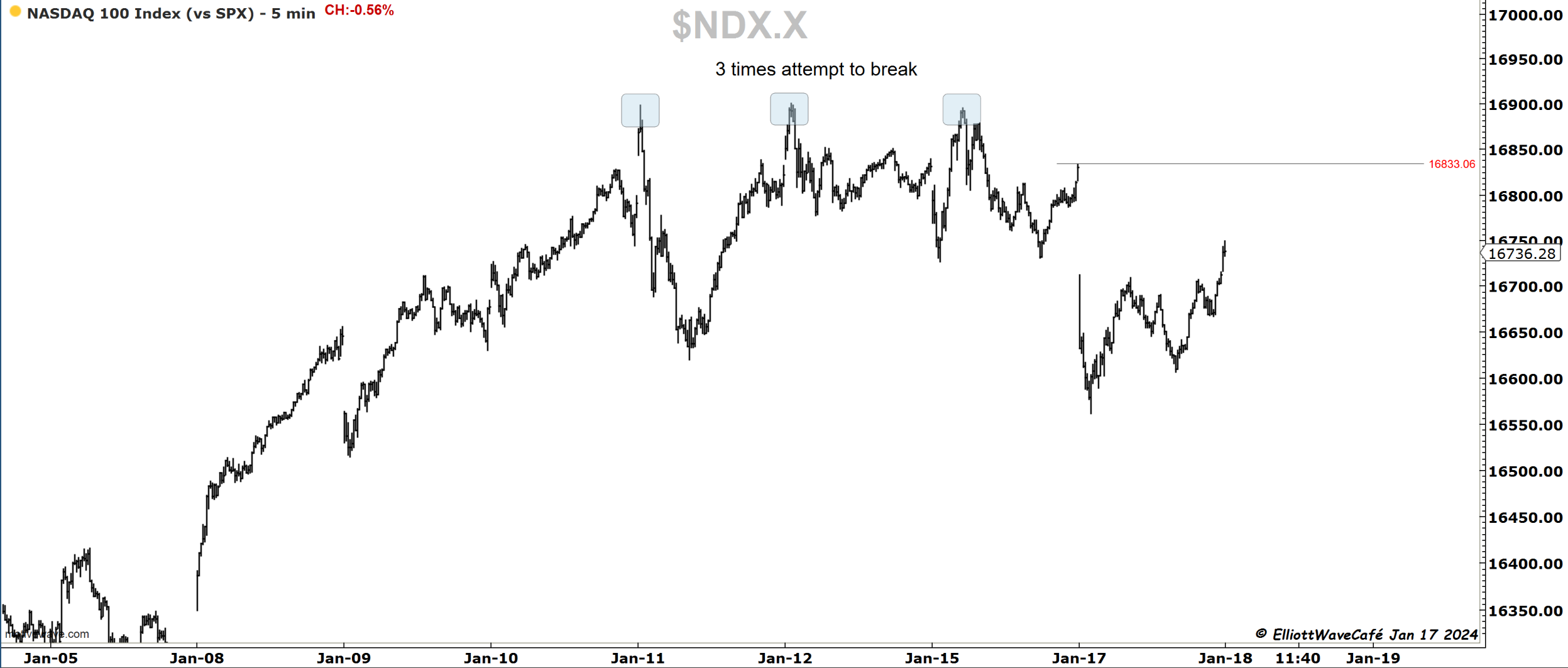 We sold off -1.6% at the lows today. We have recovered more than half that by the time the session was over. Notice the three attempts to break 16,900. There could be an attempt to close that gap at 16,833. It is right to press the downside below that level.