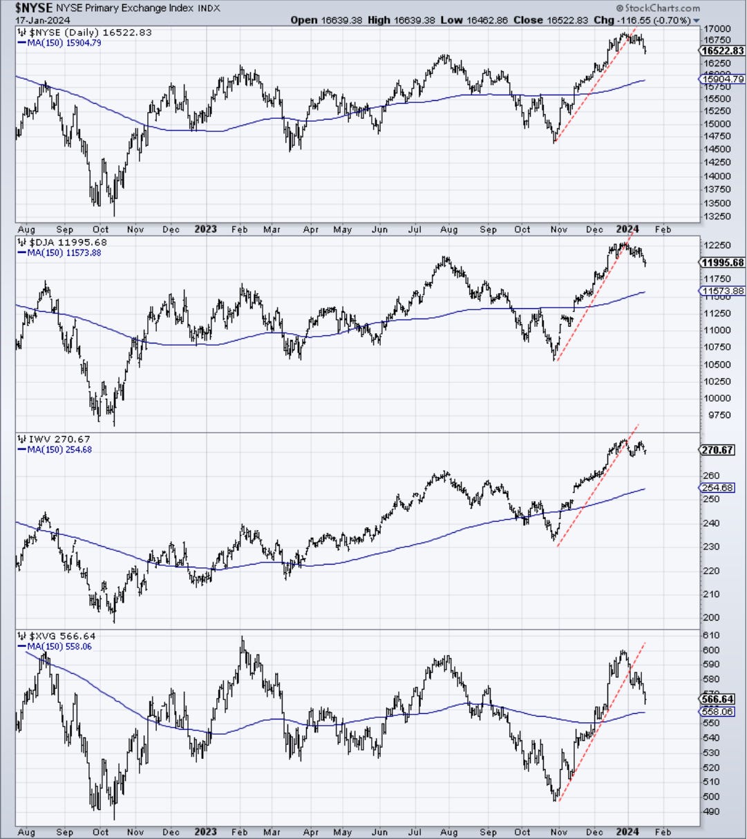 Here is a look at how the Major markets have all lost their uptrend and are now coming to meet their 150-day MA eventually. The XVG index, which is the equally weighted index of approx 1500 stocks, is the first one to get near it.