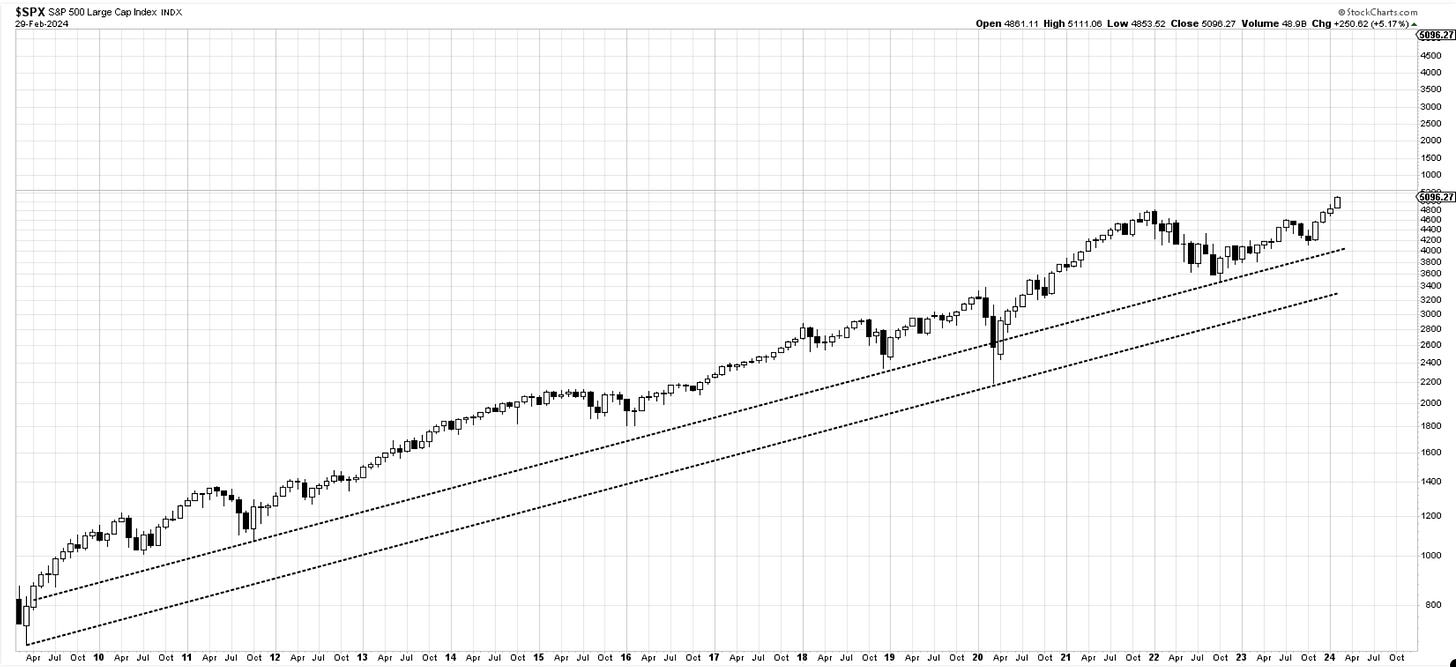 Let’s take a look at some monthly closes. You can see below the chart of SP500 in a continued uptrend. The bear market of 2022 lasted ten months, and we have now closed a second consecutive month to new all-time highs. Since overtaking the highs from January 2022, we are in a new bull market regime. We have spent four months of higher consecutive closes and closed within 5 points of the high of the current month. This type of price action is encouraging and suggests one must continue to remain invested and look for higher prices. This time frame is not on most trader’s radar. Yet, it provides extremely useful information about the market's direction and which way it is usually moving, from the lower left to the upper right.