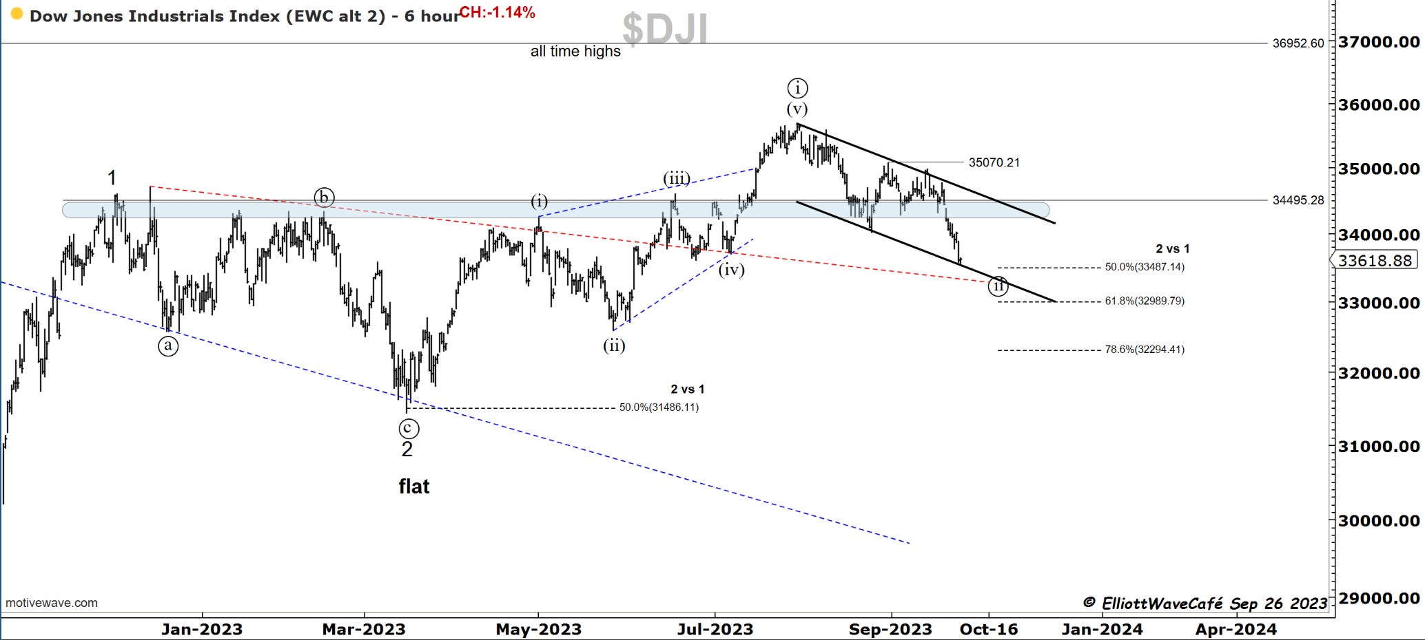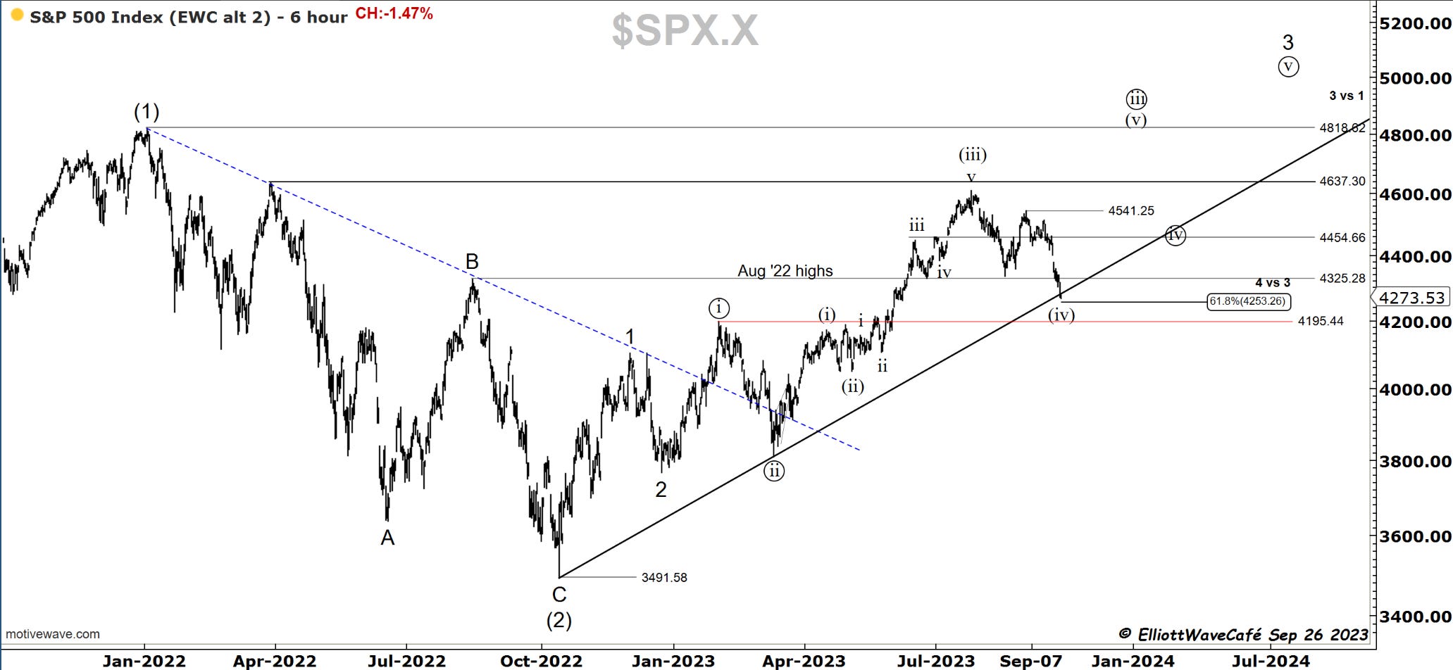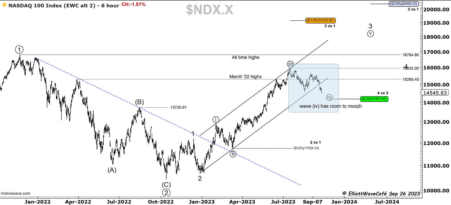 I have adjusted the count here to one higher degree. It is clear that the correction size has become quite large for it to still be part of a lower degree (iv). Since wave ((iii)) was very strong there is room and appeal for this wave ((iv)) to unfold. The .382 sits at 14,157 and just above the Aug ‘22 highs.