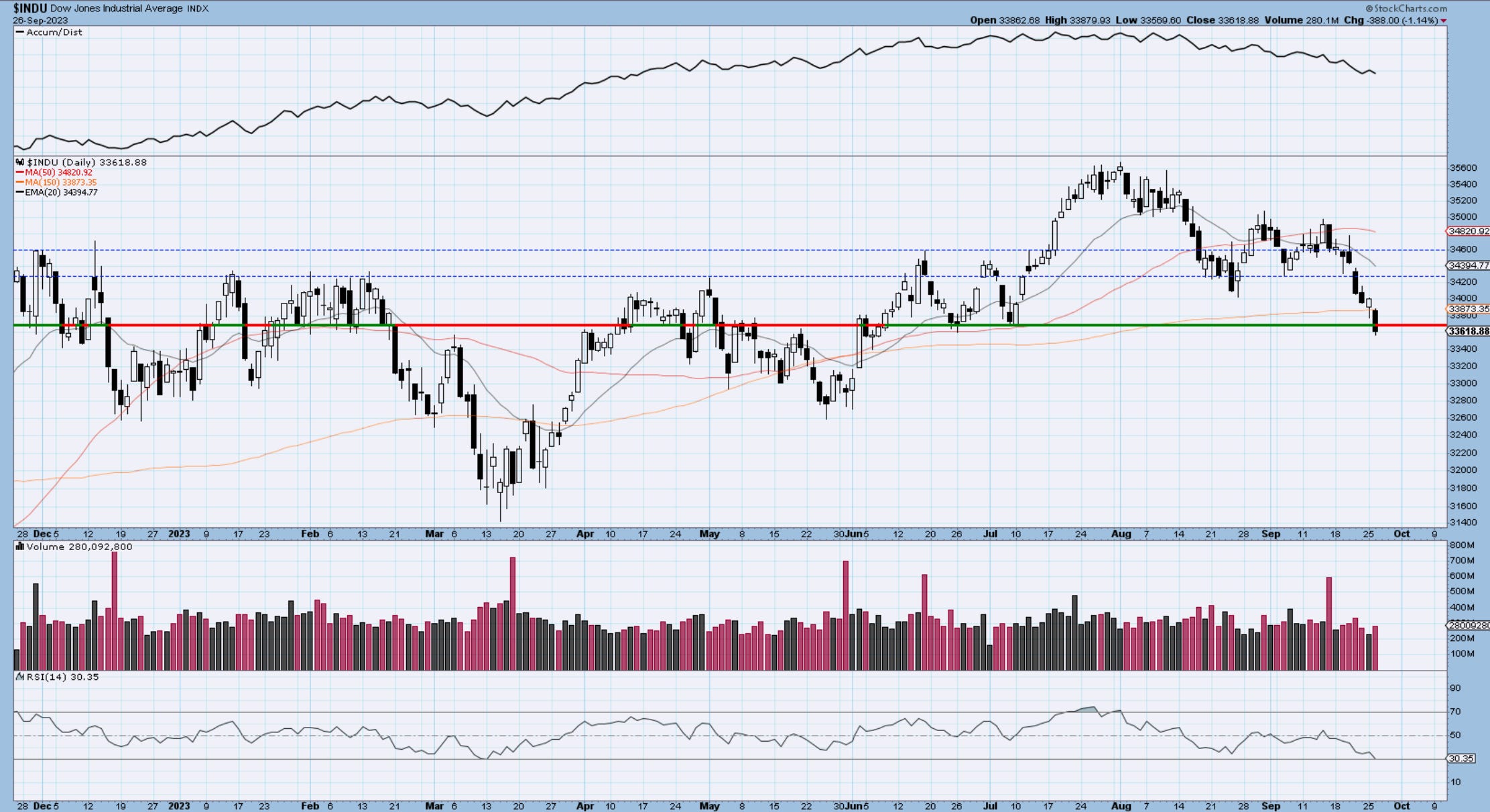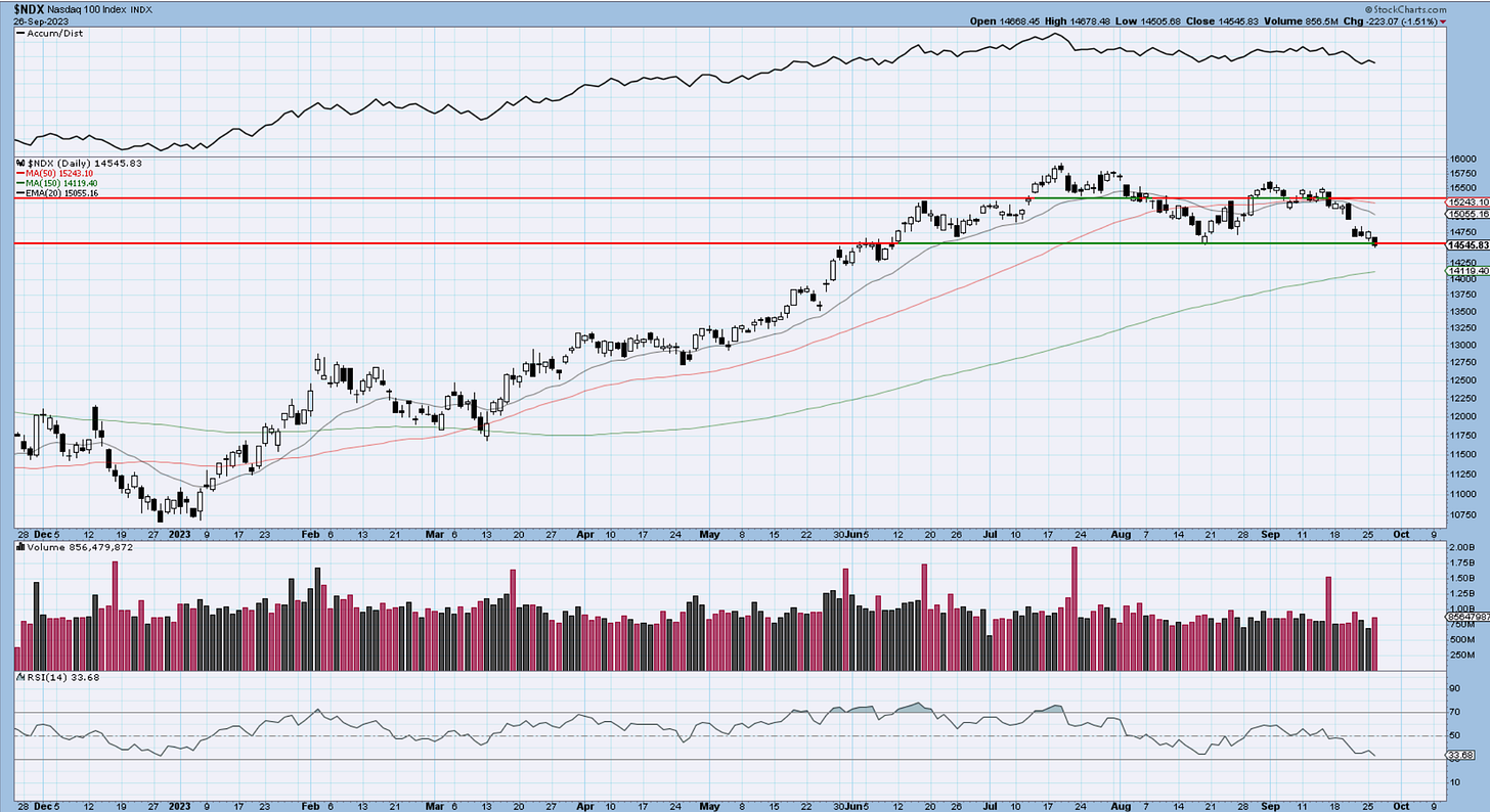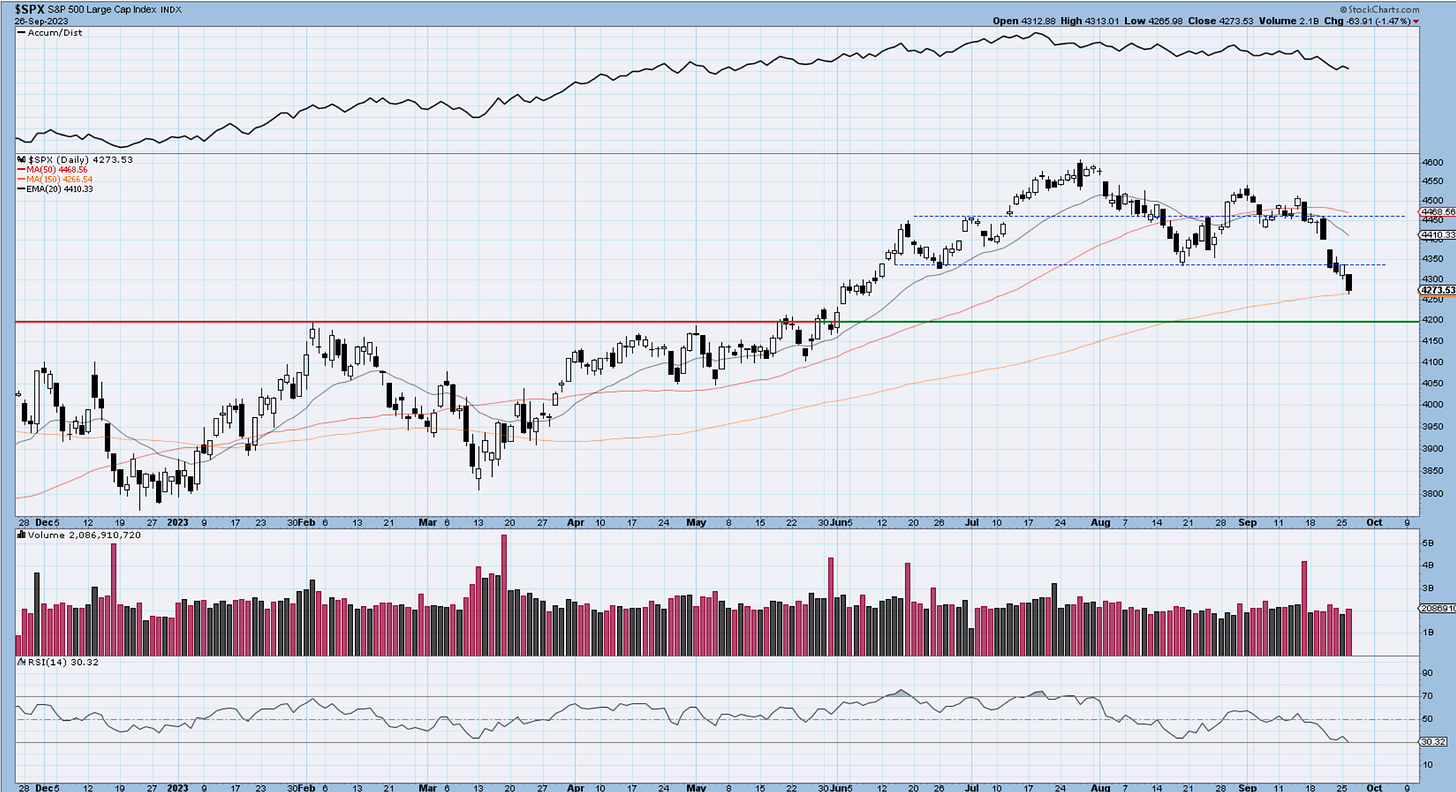 We gapped lower this morning and did not really look back throughout the course of the day. We are now very close to that very key 4200 levels. We broke out of that zone at the beginning of June. The 150-day MA rests here as well. If we get below those levels we have one more defensive stance for the current count and that is the top of wave 1 ( with wave 2 being a running flat instead of ((ii)) ). No evidence yet of price stabilization but we’re getting very close to it. Those levels will offer great risk/rewards for anyone trying to put some money to work. I see it as a decent fighting zone going forward.