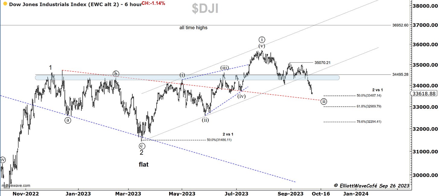 Dow sits now at about 50% of the entire rally from March. We seem to be missing a wave 4 and 5 on the latest decline, which suggests we could hit 61.8 before a meaningful bounce. I continue to favor this for a wave ((ii)). Check out the nice lower channel touch on the 2nd chart.
