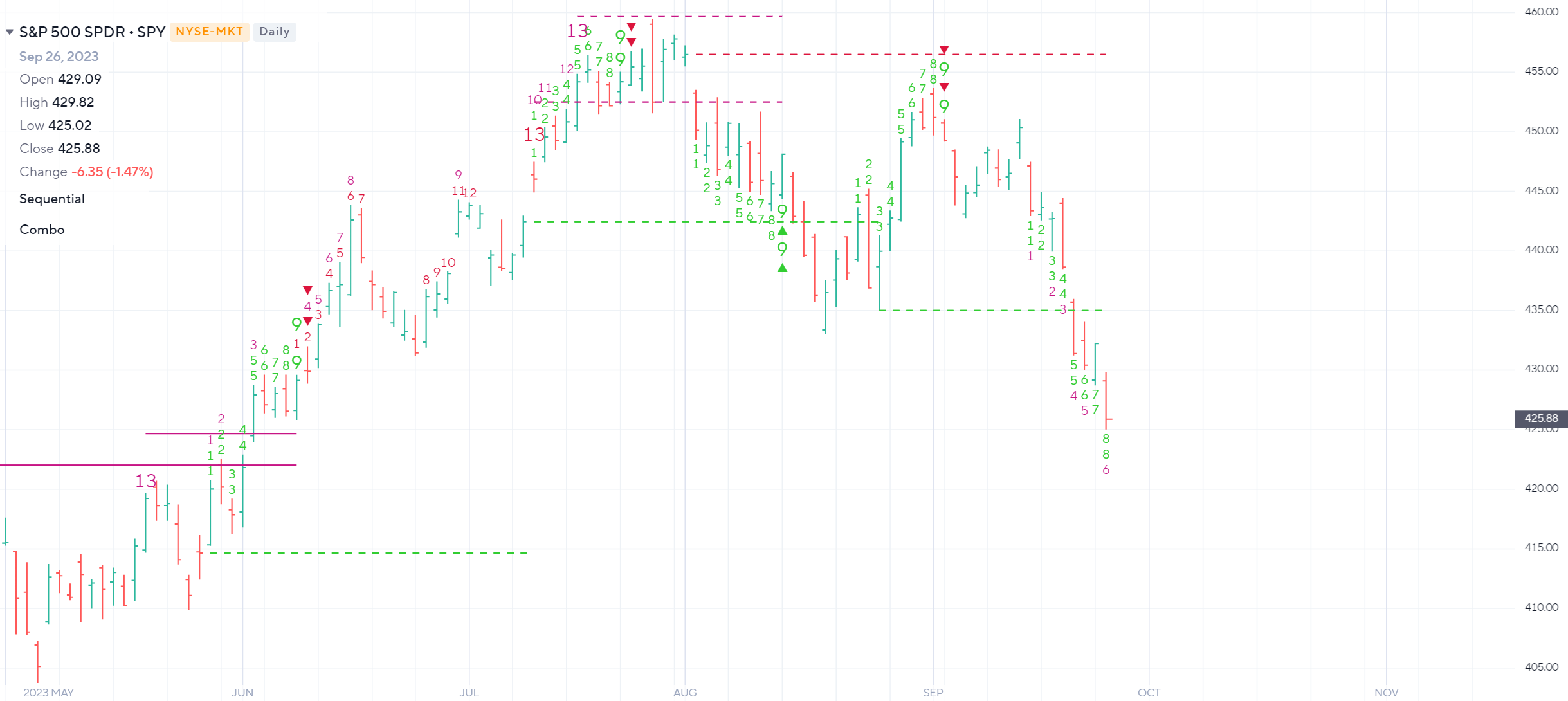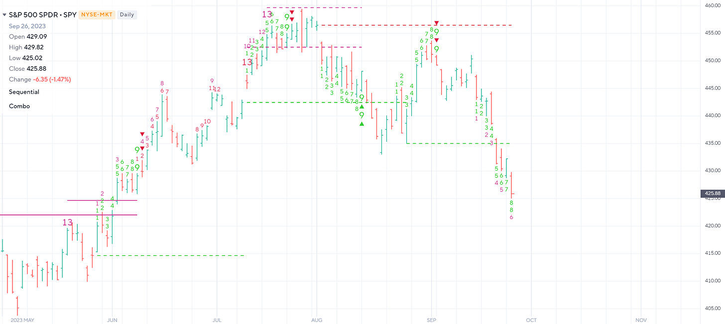 The 3rd chart shows the DeMark countdowns exhaustion and we are within a day of posting a 9 buy setup. It usually leads to a few days of upside and then we will see from there. It could just be the buildup of a 4th wave, with one more drop to go before the real rally higher begins.