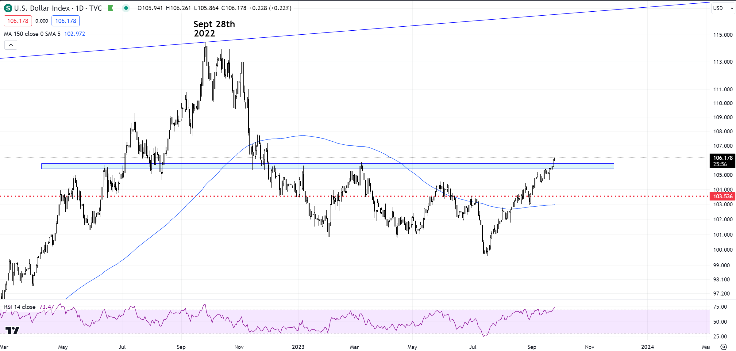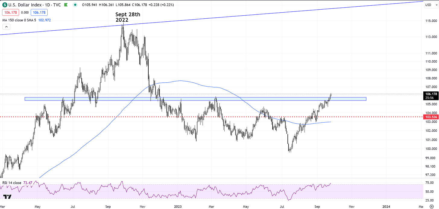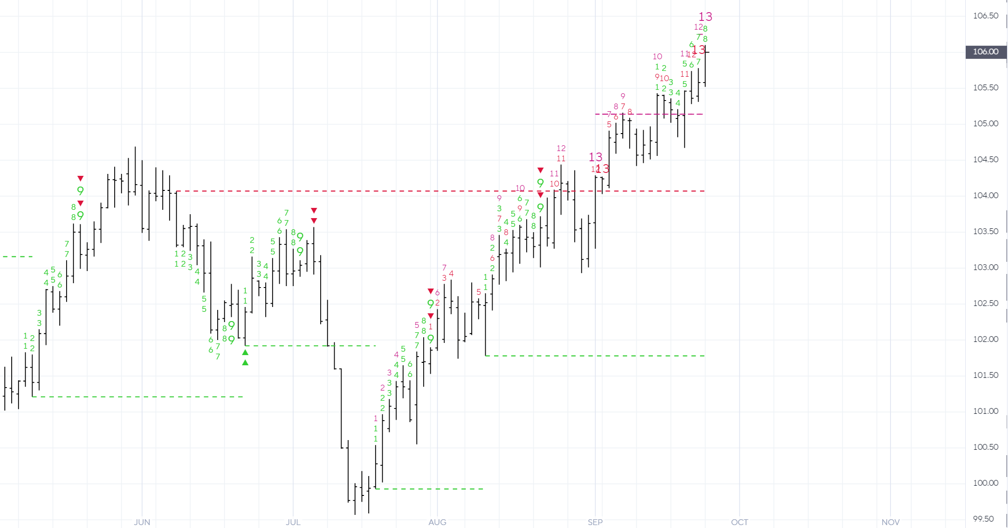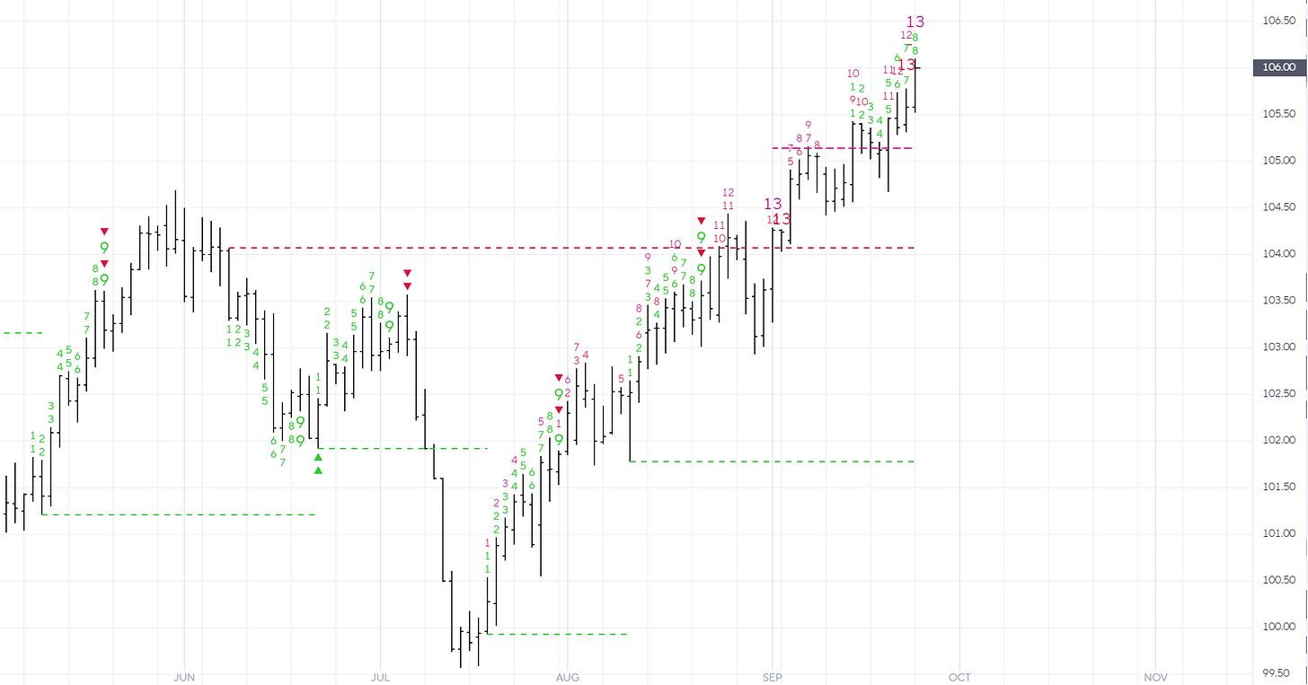 The dollar is now within a day of its 1year top anniversary from Sept 28th, 2022. Interestingly enough, we’re getting exhaustion signals from DeMark just as we’re breaking out above the resistance zone. We will need some price confirmation to secure the top but this index is key to some relief in the risk on trade. Yields have been strong but only belly of the curve and the long end, not the short end. Let’s see how this plays out.