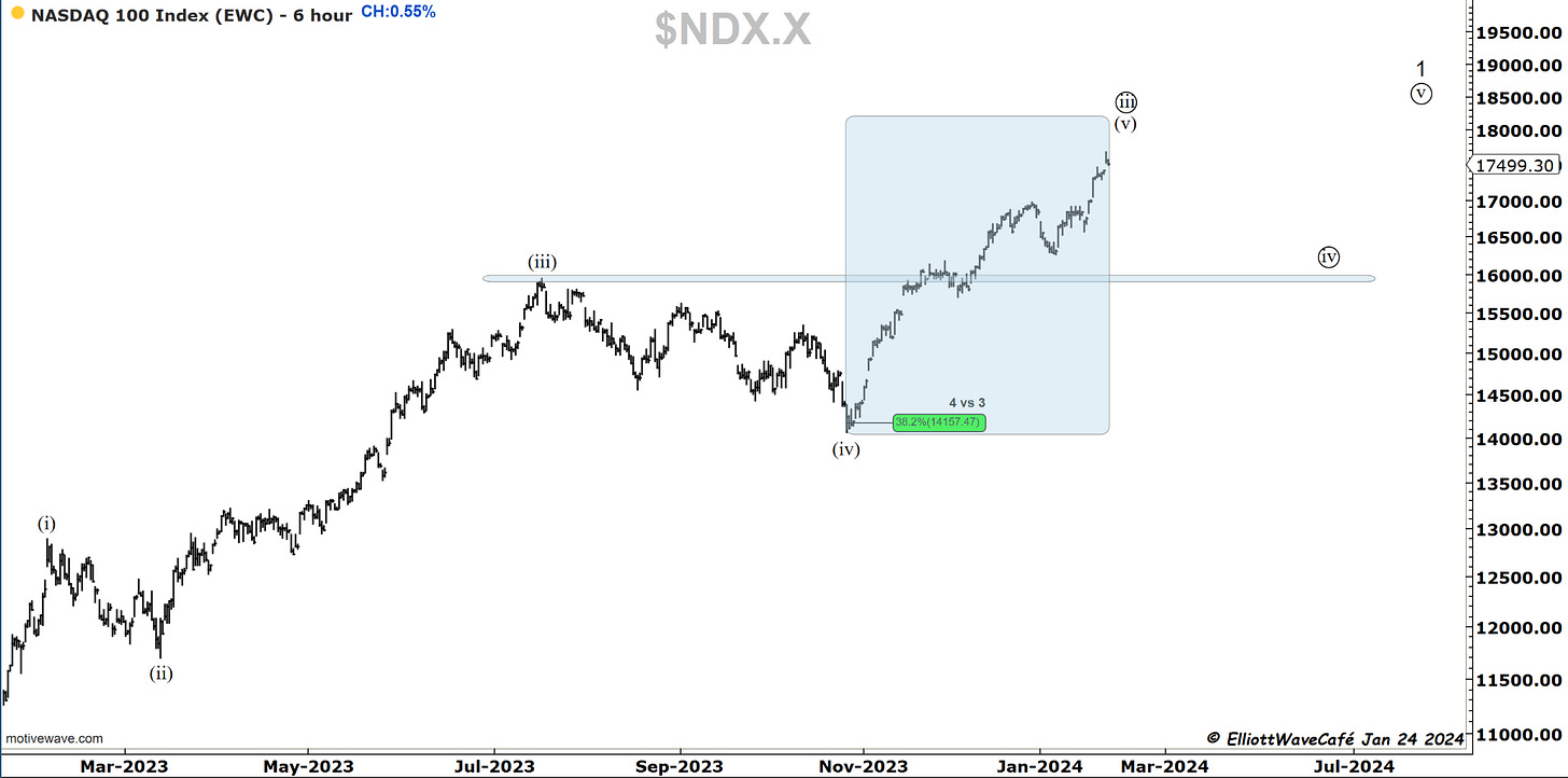 I will be honest with you. From an EW perspective, the structure in blue does not appear complete. The wave in the middle is the smallest. That unqualifies it as a third wave, and it creates issues at the current juncture. It appears that a few more legs higher would be needed to give us a cleaner view. If the market breaks below 17k without going higher first, we will have some labeling issues. I'm looking forward to seeing how this resolves and if today’s closing selloff is enough to trigger anything bigger, or it will quickly get bought up, and we will travel up again.