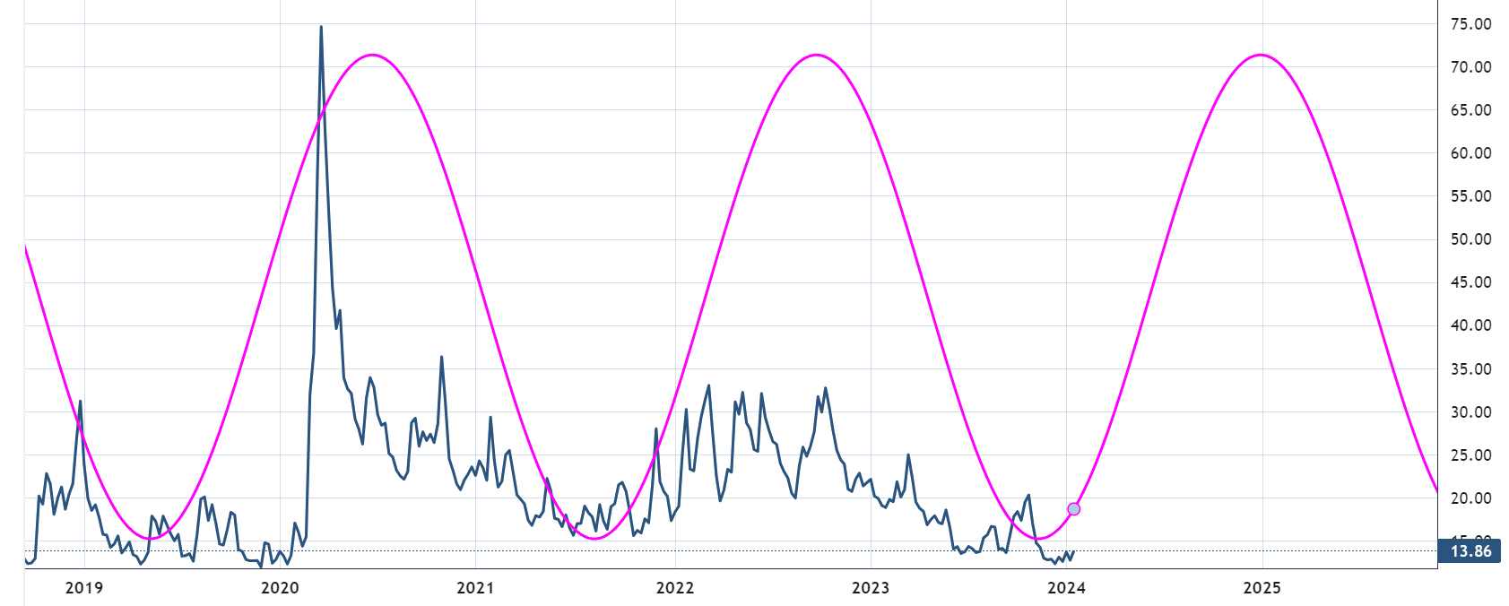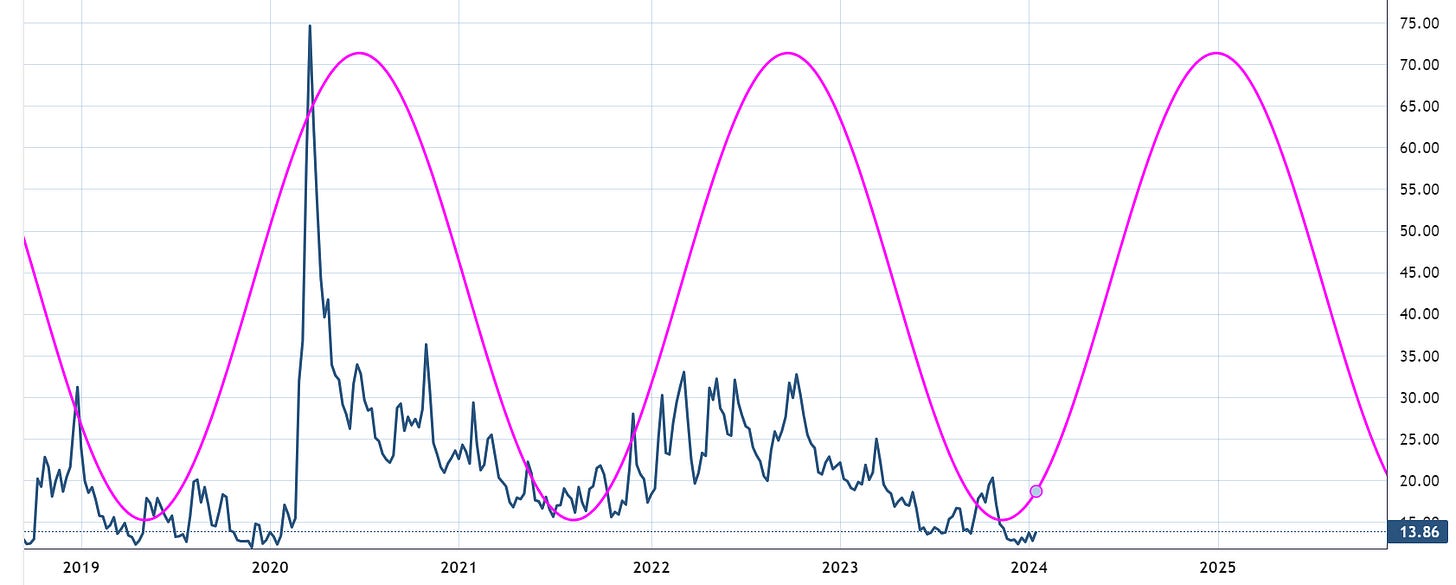 Here is the VIX weekly cycle; it is due for some serious upswing during 2024. How will it happen I have no idea. How high will it go? I have no idea. What I do know is this: if we’re getting into a higher volatility environment, it won’t be to the upside in risk. High volatility means downside price action in risk. Just a thought. Cycles are not perfect. This is the current active 120-day cycle.