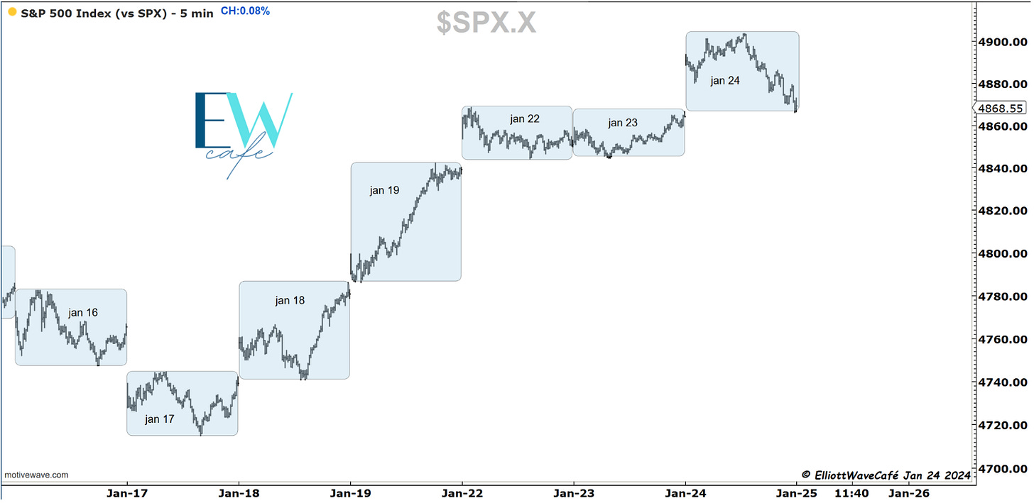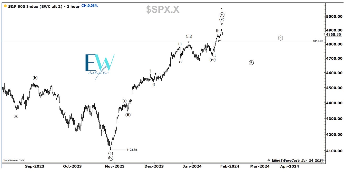 For the past couple of days, I have been presenting this push higher as a 5-wave move, anticipating this push to new highs in wave v. Today we have gotten a slight taste of this being the correct approach. Further breaks lower below 4800 should solidify this call. We would be looking for a wave ((a)) to start forming.