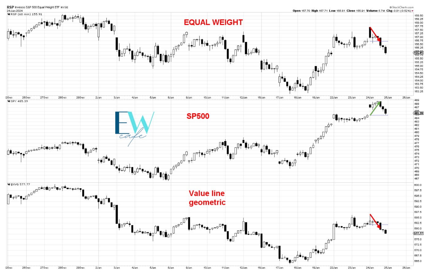 You can see what I was referring to in the picture below. The Sp500 was pushing higher without strong participation from the core market, shown here via the equally weighted RSP and the value line index XVG. It was putting in doubt the sustainability of the move. This is not an isolated incident; it has been happening since the year began.