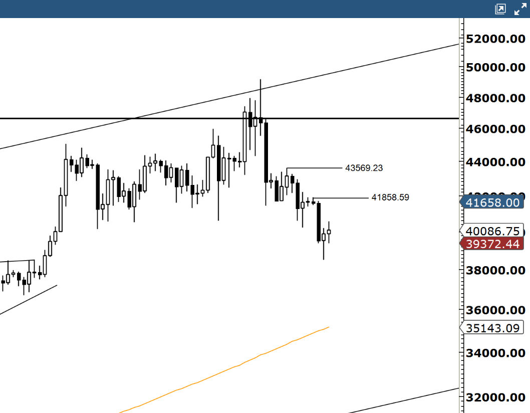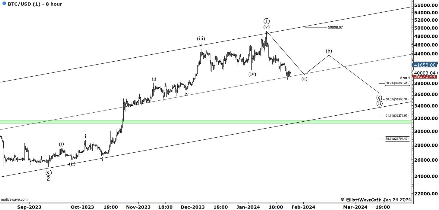 Sellers will likely show up again near 41800 and then 43500. If those levels get taken out, we can discuss the (b) wave. For now, it's still a bit premature. By the way, as a suggestion, trading B waves is a pain in the but. Stick with the A waves and even better C.