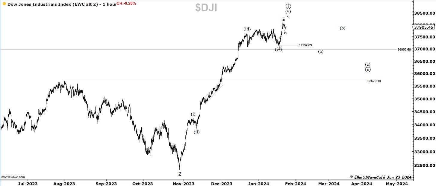 Here are my comments from yesterday: Dow was negative as well, but it seems that one more push higher would terminate a 5-wave impulse. Then, we would look for a breakback below 37,800. I have sent an alert out today to members about opening short positions in this market.