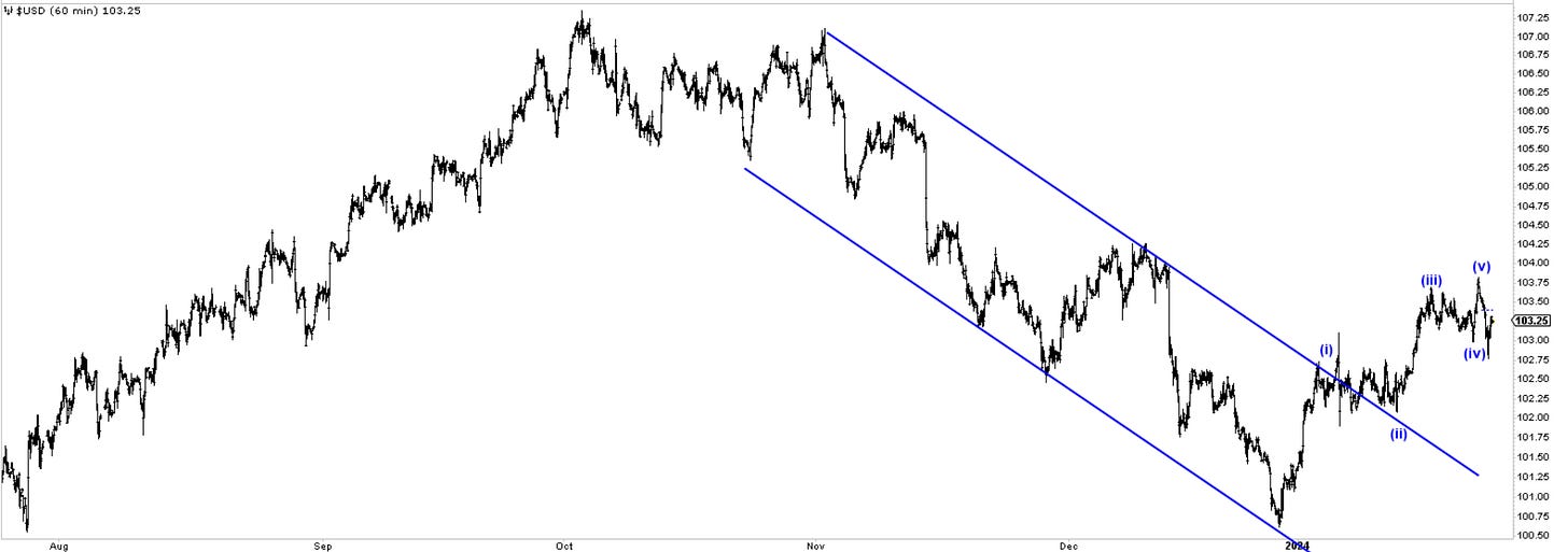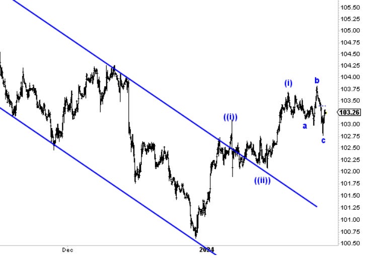 The second chart shows how a quick expanded flat can form in wave two at the lower degree. Let’s keep an eye on this. If we break back above 103.75, I think we’ll have our answer.