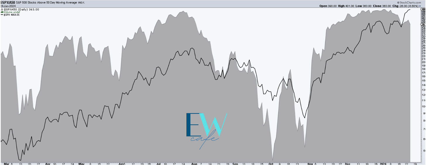 The dark area below represents the number of stocks above their 50-day moving average. The divergence with the price of the SP500 is now quite apparent. Notice how, at the lows in October, the number of those stocks was improving while the market overall was making new lows. It’s what gave me the confidence to put on the bullish hat when most were calling for Black Monday events.