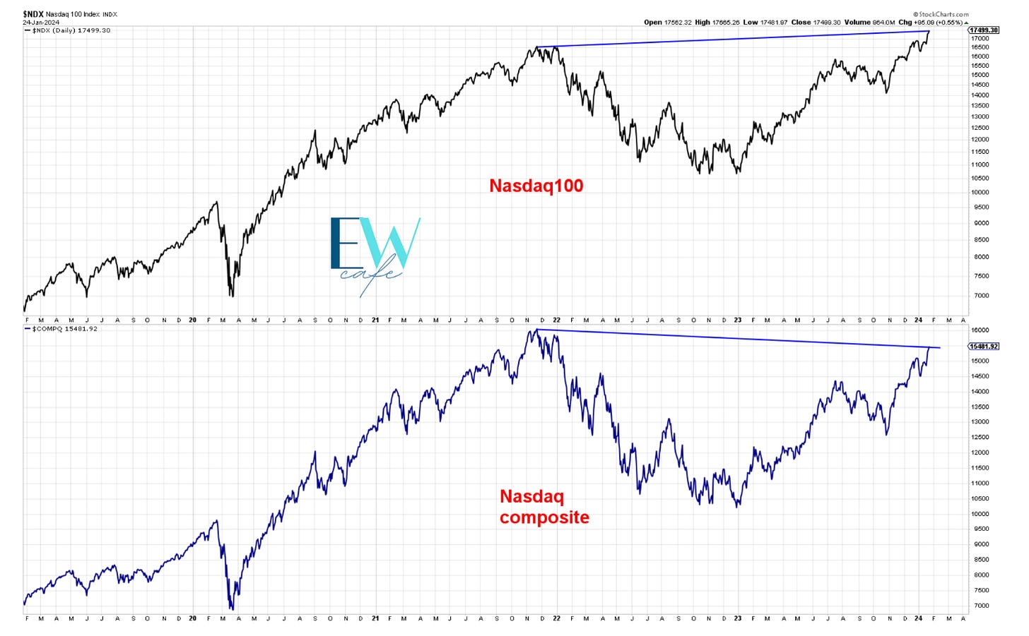 Something to think about below. The top panel is the top 100 stocks in the Nasdaq, and below, we have the rest, 2400. Not to say that the index won't follow suit higher, but for now, it hasn’t, and it warrants attention. You can see the same type of divergence if you look at Dow vs Transports, something I have displayed here several times.
