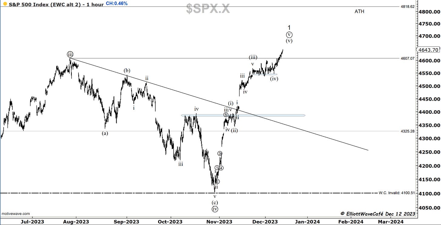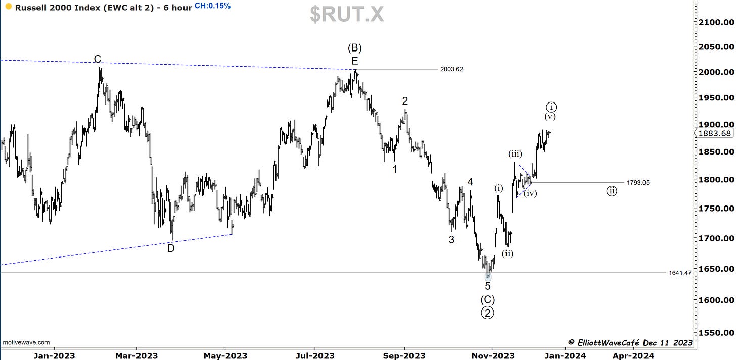 The Russell was a bit calmer today but revisited the highs from last week. I am keeping the current count but notice how the the advancing legs are within close equality of each other. That could be a sign that something else is going on structurally. ( a 1,2 1,2 from the lows without the triangle,or a complex correction). We should know more this week. Once above that (B ) wave high, there should be some clear traveling towards ATH.