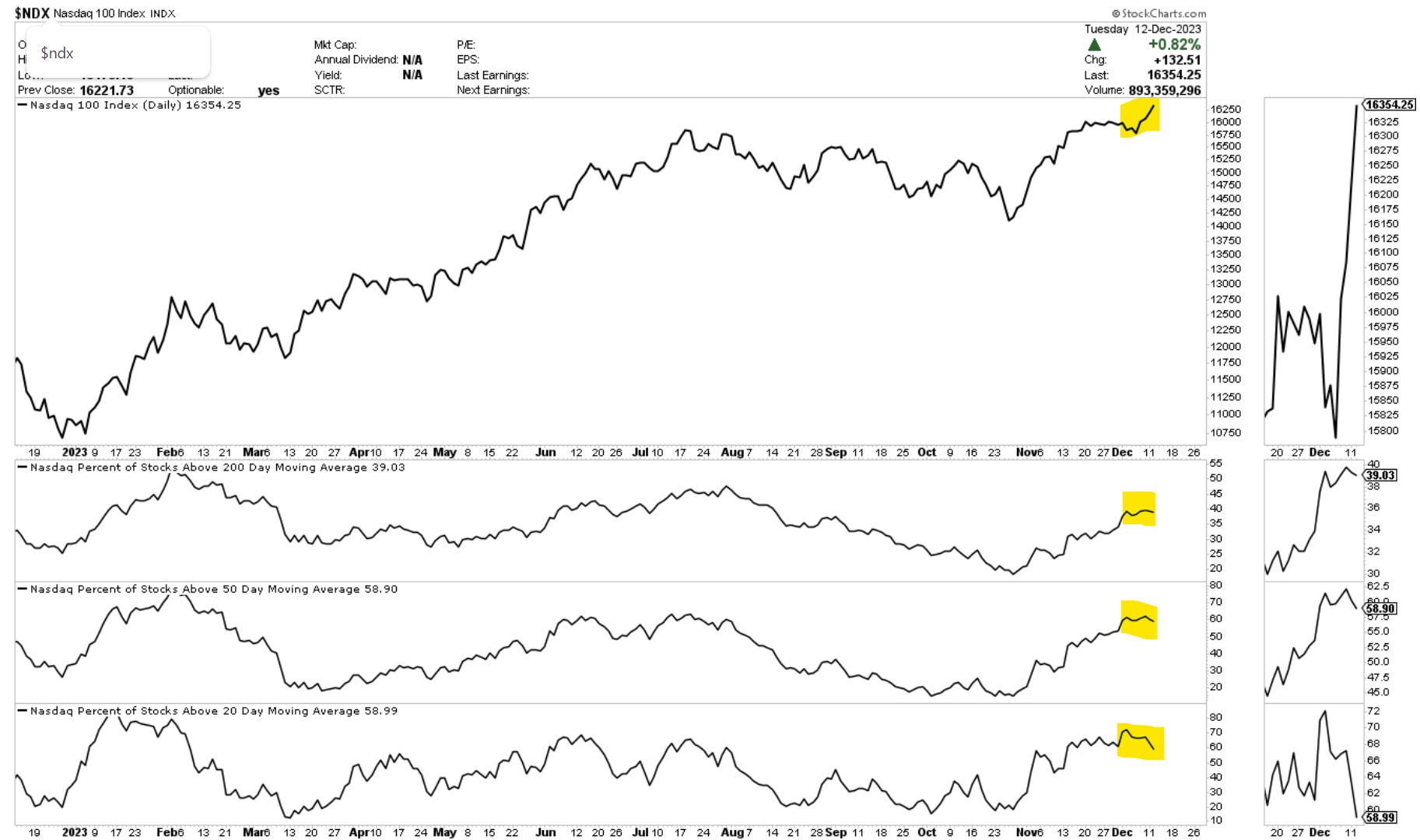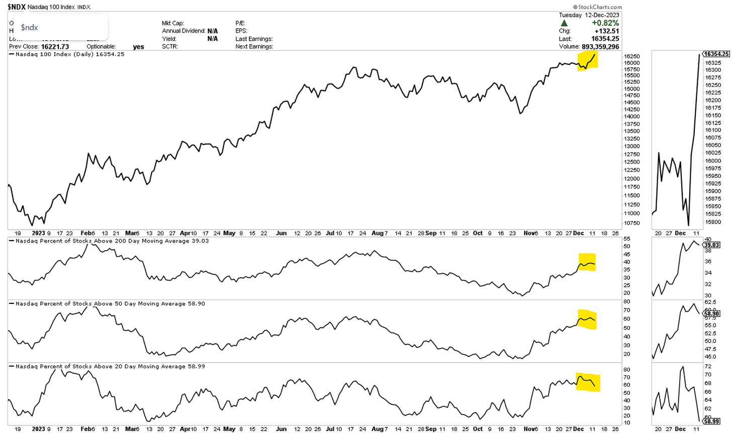 If you notice on the chart below, this is how we form a head and shoulder formation. There is a rise in a 5th wave, followed by a drop in wave a of a corrective pattern. The b is what creates the right shoulder. One of the things that’s needed is lower volume as we get higher, and that’s not really dropping much in the Nasdaq. It is worth noting that we’re having one of the best days regarding 52-week highs, but lots of stocks decline below their 20-day Ma and stall at the 50-day. The declining stocks are also increasing. Keep a close eye on this behavior as we trend higher in this wave.