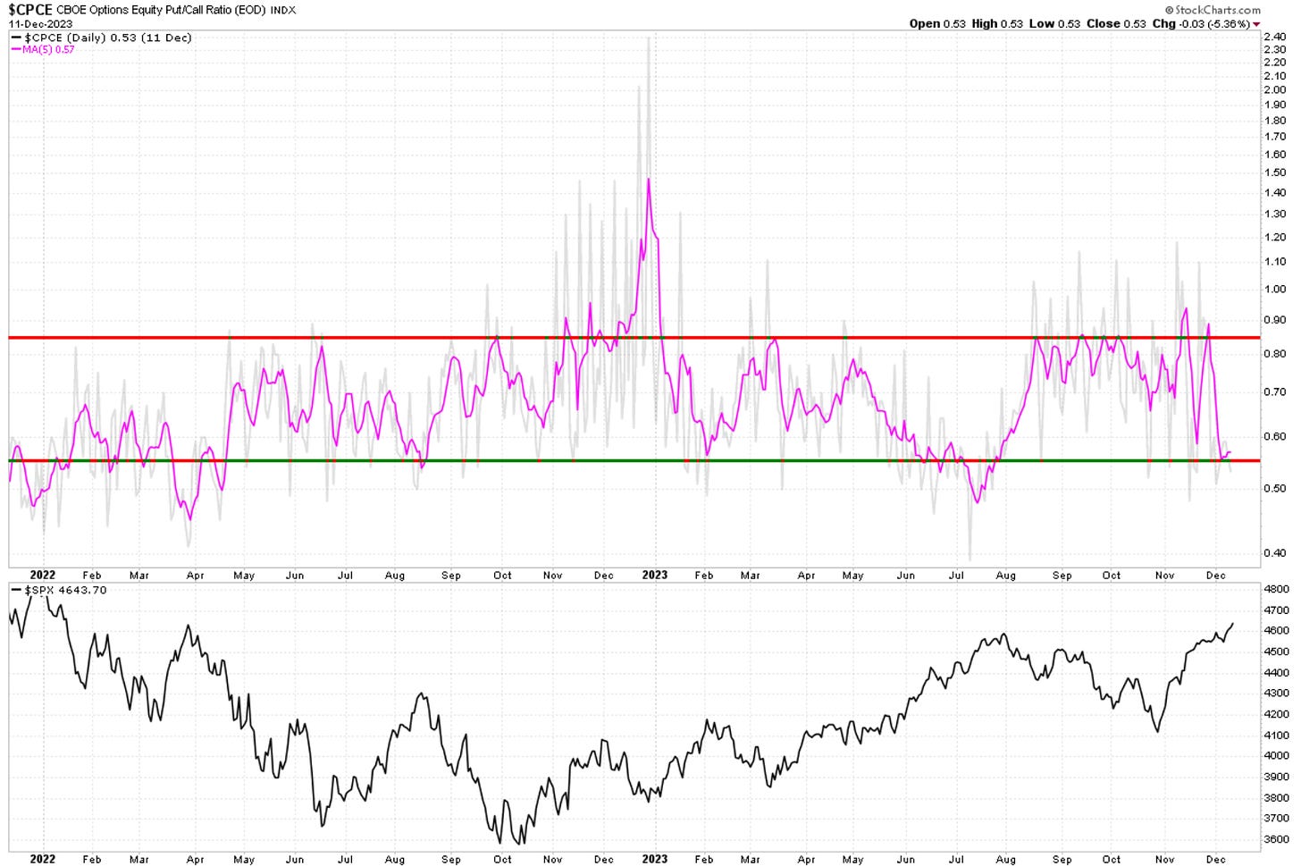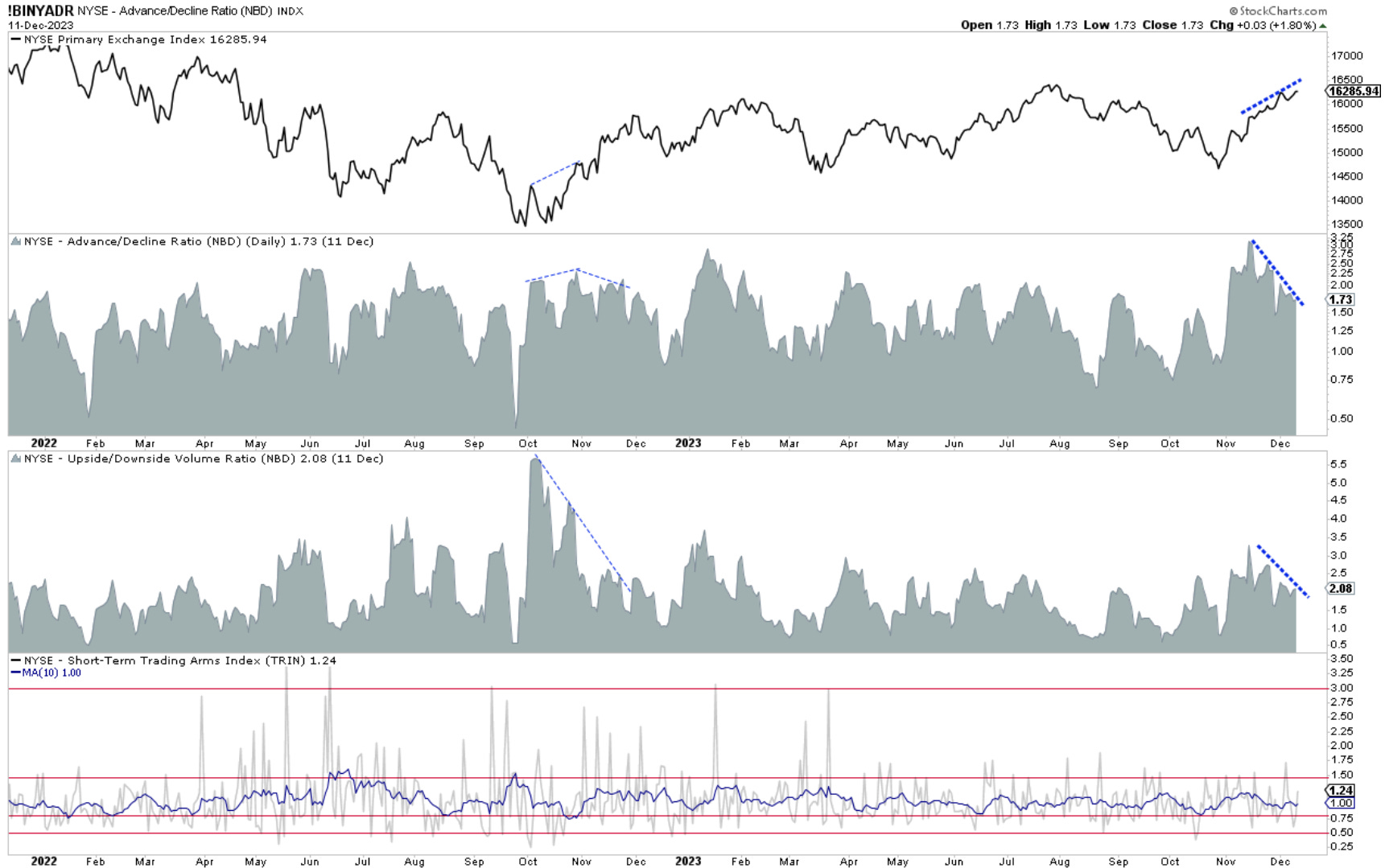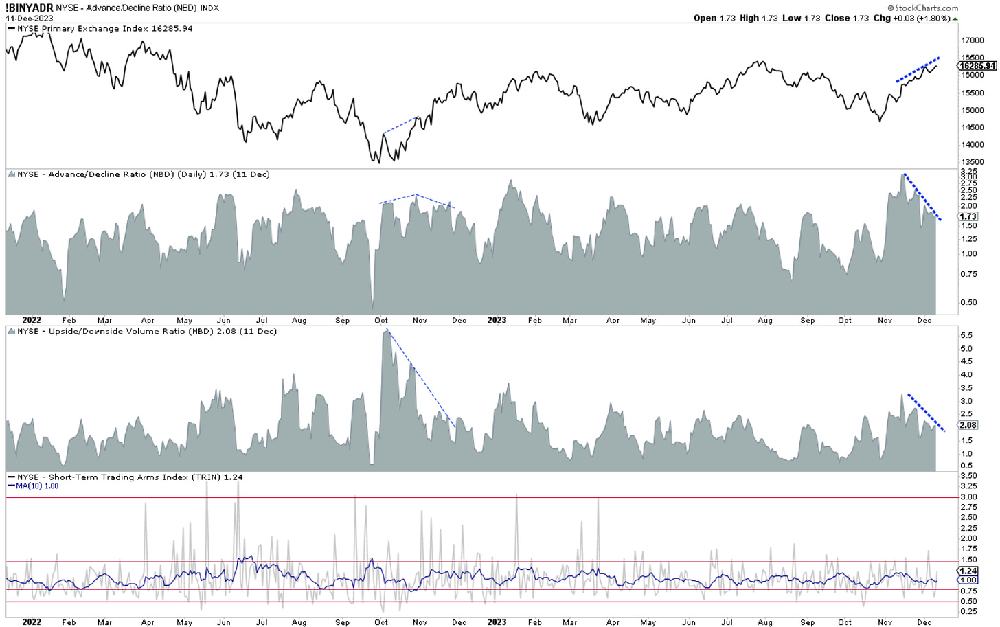 The put/Call ratio touches levels where traders feel very comfortable buying calls. It serves as a contrarian indicator. It could go a bit lower, but it is starting to flash warning signals. The last chart looks at the volume of advancing stocks vs declining stocks, and you can see how there is less and less powder provided to push these stocks higher.