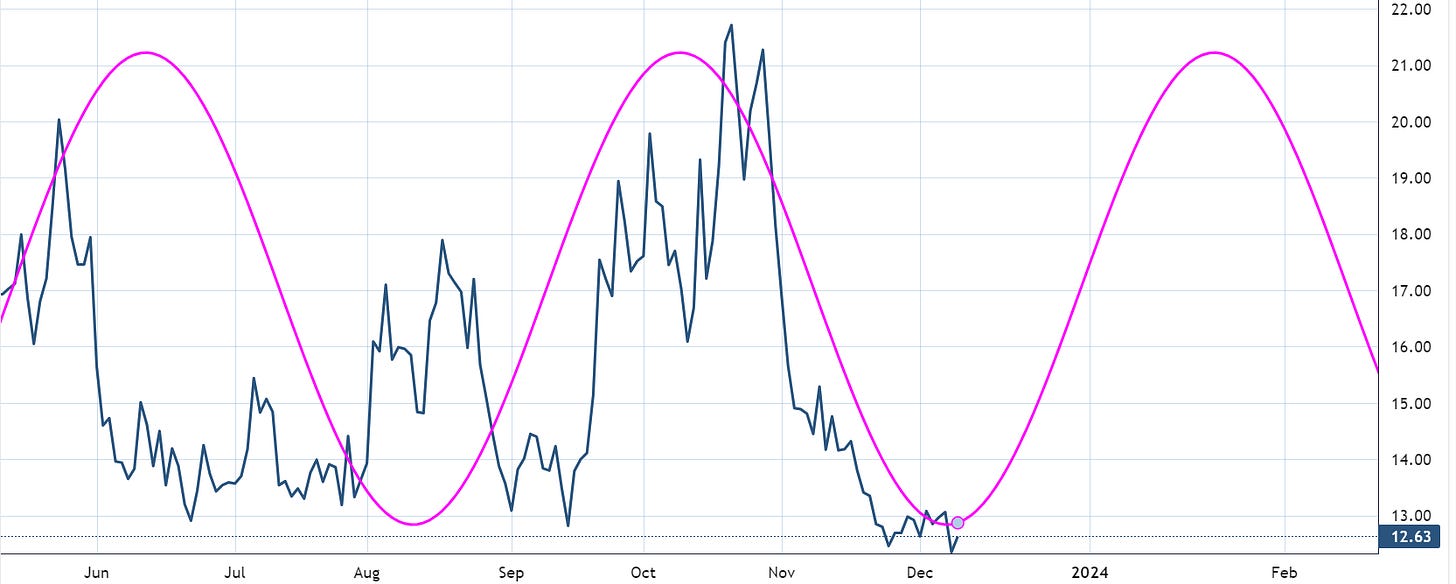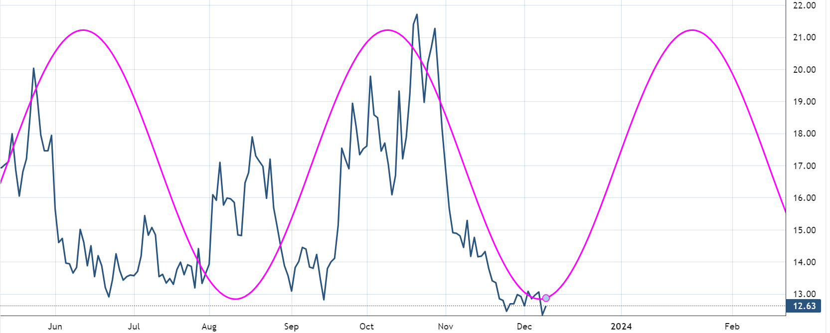Here is the 150-180 day cycle in BTC suggesting a likely period of weakness upcoming. The depth of the correction is not what we’re looking for here but rather time spent on it.