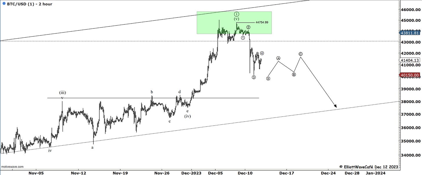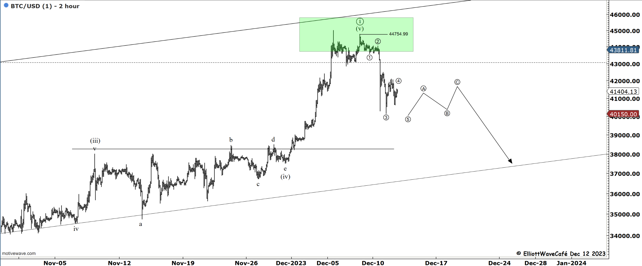 The move from the highs in BTC is impulsive. Either from here or after another quick push lower, we should correct in 3 waves, followed by another decline. If we get back above 44k it’s likely this drop was just wave C of a flat. With that being said, even if we make an additional high, it should be short-lived.