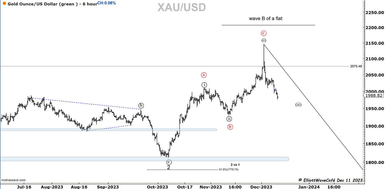 Gold‘s failed breakout continues to manifest itself through further drops in price. It appears more and more likely that an ABC-type move took place. A move like that to new highs is usually B wave of a flat. That 1,2 1,2 idea is hard to swallow at this juncture.