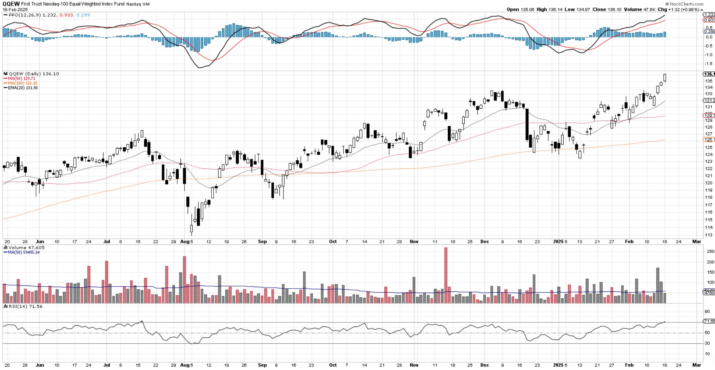 Here is the QQEW - the equal-weight version of the QQQ that shows good interest in stocks outside the big well, known names with heavy weighting. Nice solid action.
