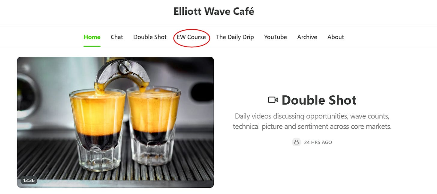 If you’re new to Elliott Wave or need to refresh, there is a 7-hour video course with downloadable slides under The Coarse tab on the website. Requires a yearly “Founding Member subscription.” You can find it HERE.