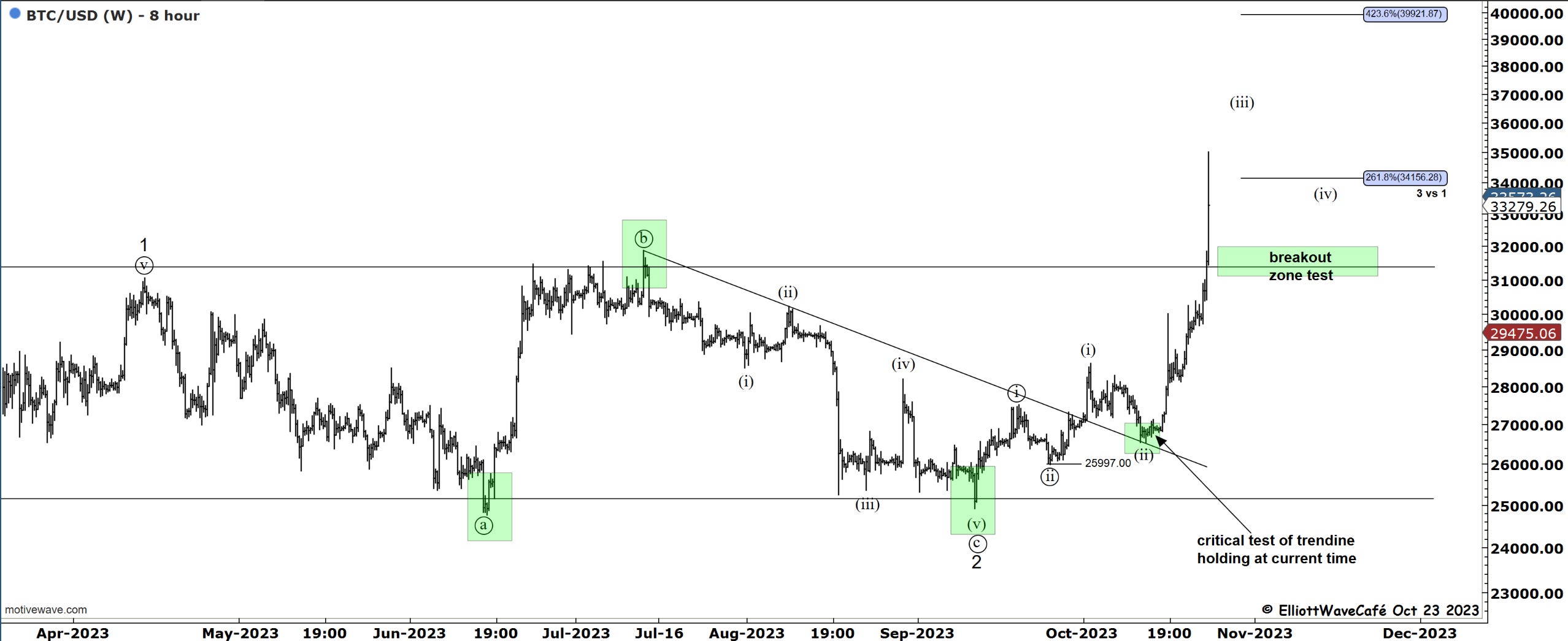 As I am typing BTC futures just hit 34,790. This is how a great 1,2 1,2 is suppose to develop and react. The truth is that BTC has been acting quite resilient in the face of risk assets selling and has somewhat been hinting at a potential breakout. Measuring targets here will be difficult if this continues, but as corrections take place we should ba able to identify lower degree waves. For now wave (iii) is in progress. That means we need two sets of 4th waves before the larger degree even begins to end. I would watch for a retest of the breakout 31k zone and see how we react if we get back there. We might not.