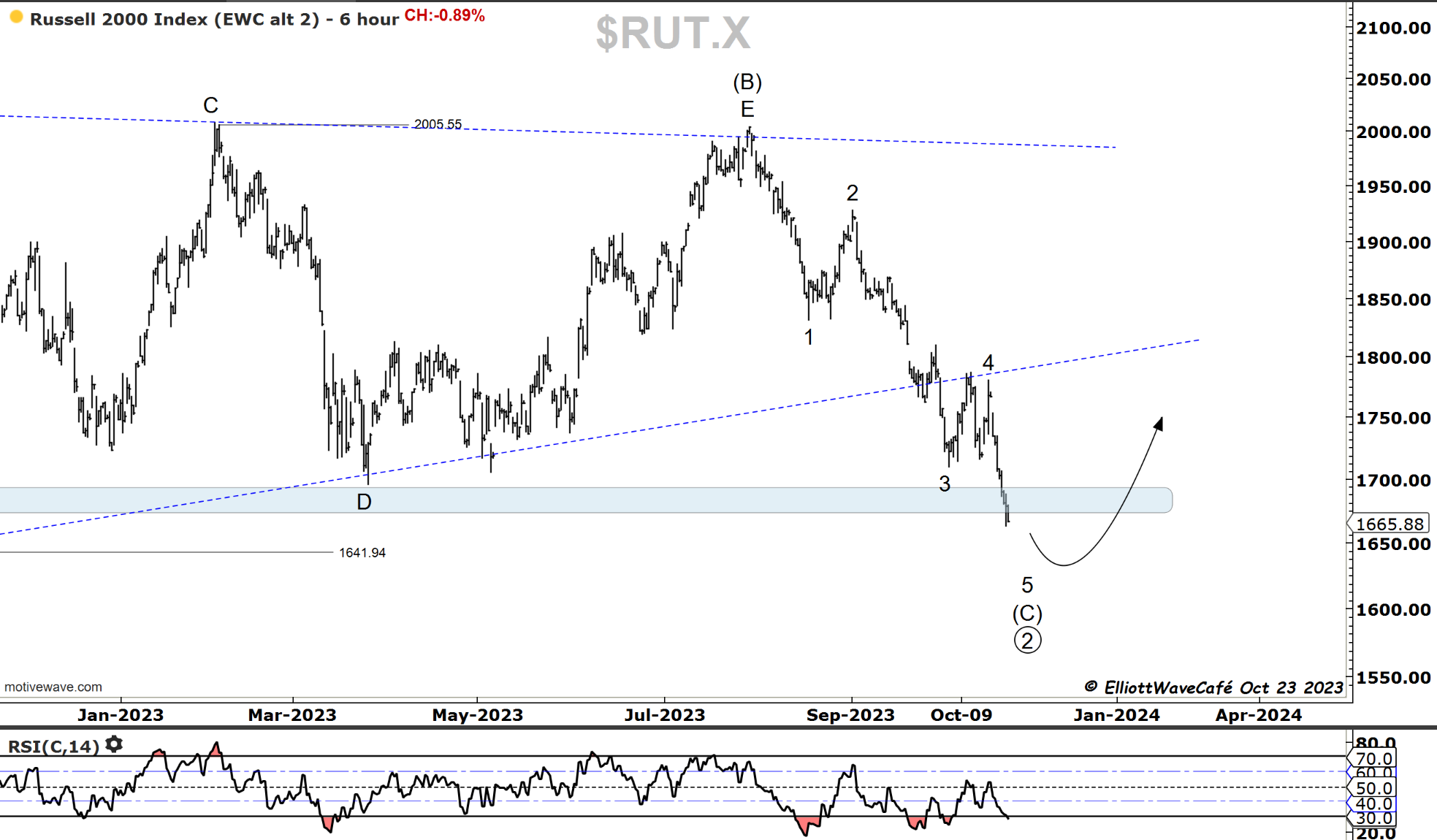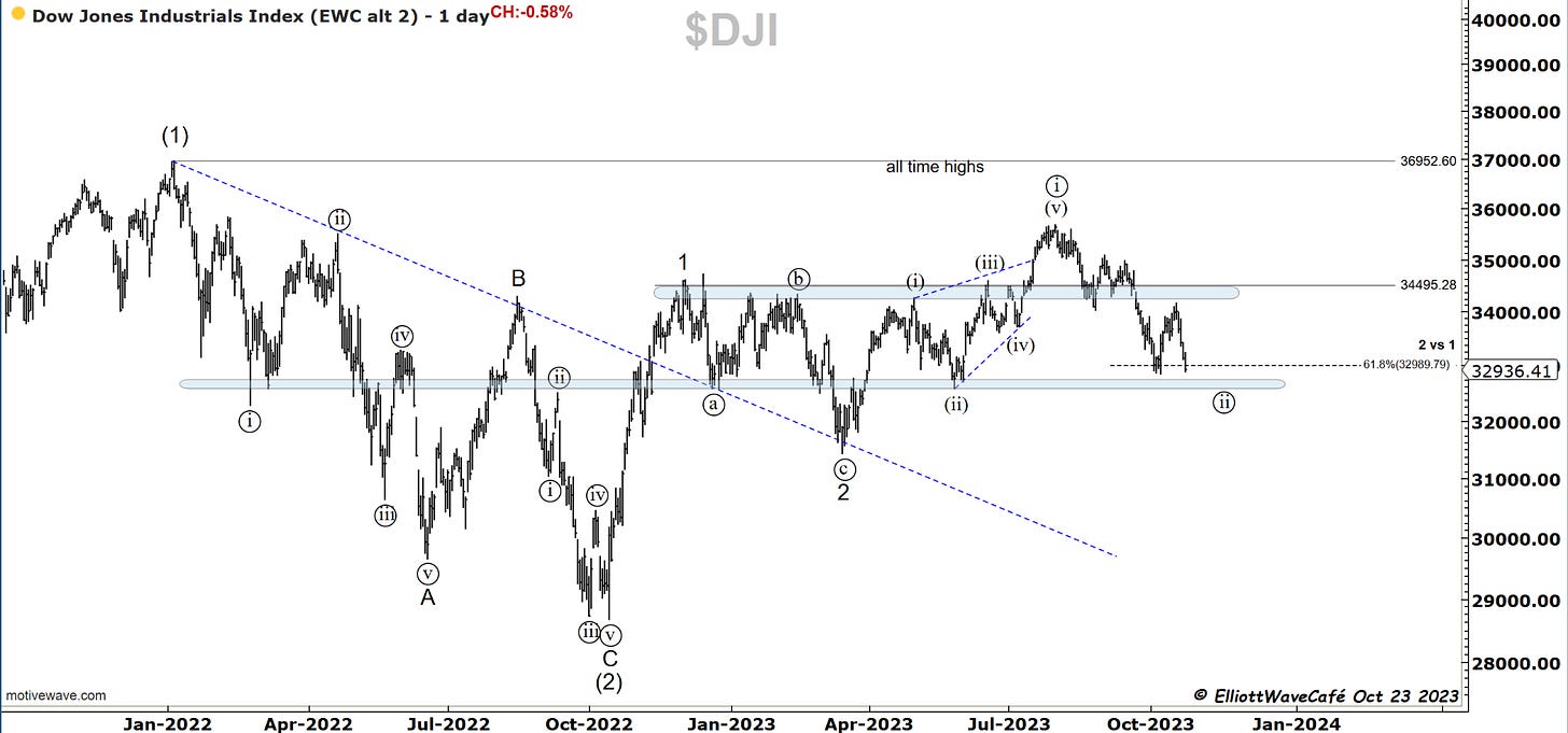 Dow Jones it’s trying to hold the 61.8% and just above a good demand zone. Not sure how to label this a wave ((ii)) with the appearance of a 5 wave move. There the flat variant where wave 2 on chart is wave A of a flat , wave ((i)) top is B and current decline is C in a much larger wave 2. It’s a stretch but something to work with in the event we rally and overtake 35k. The range here is pretty massive.