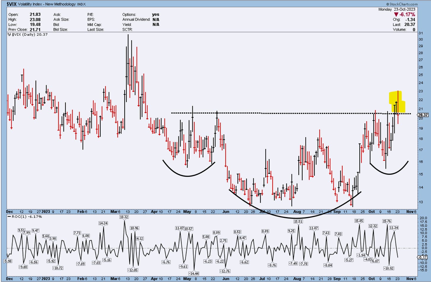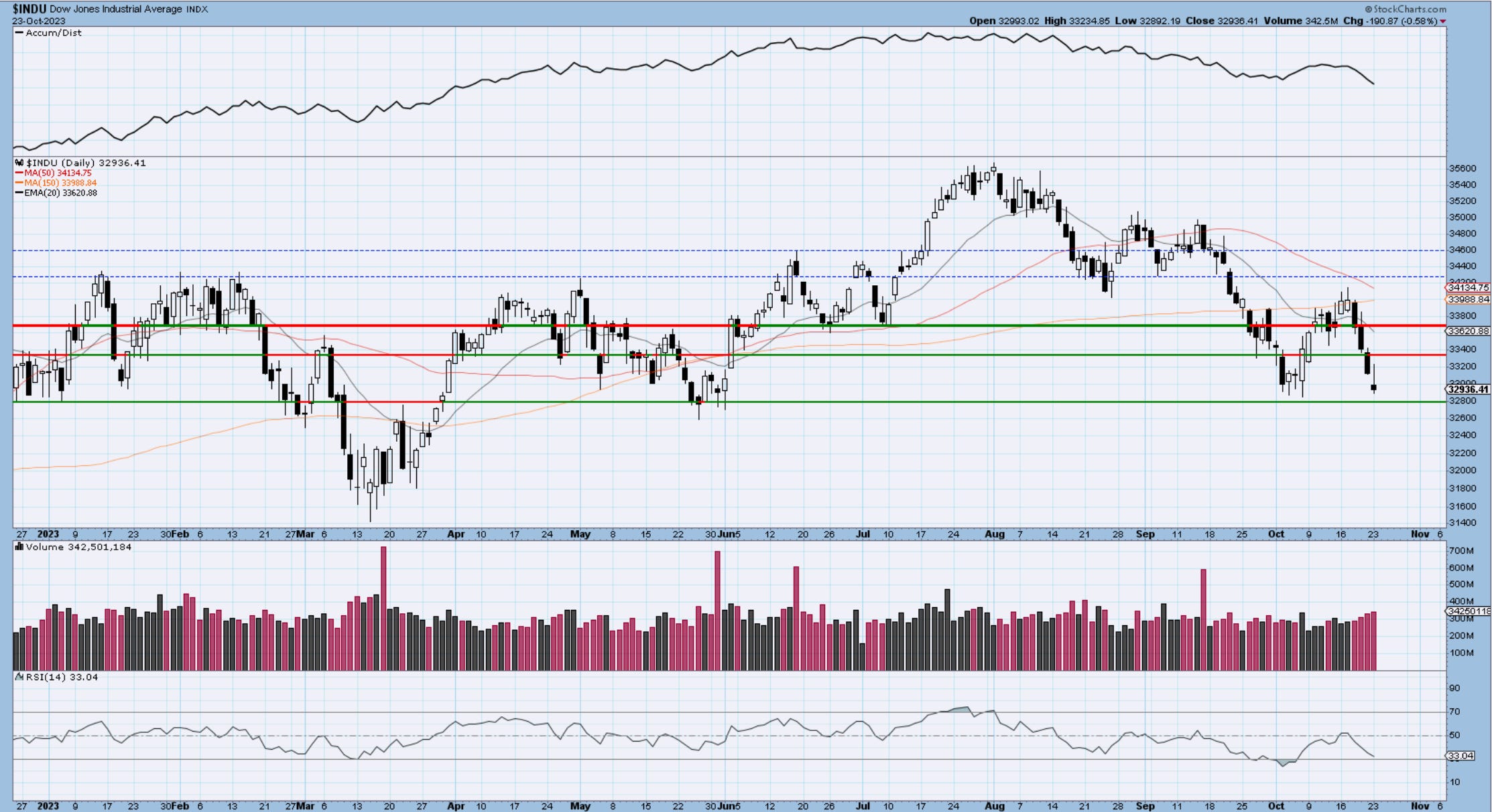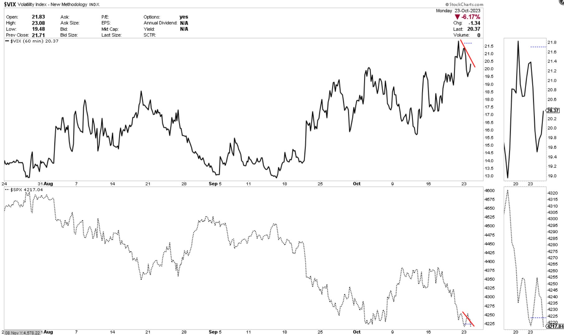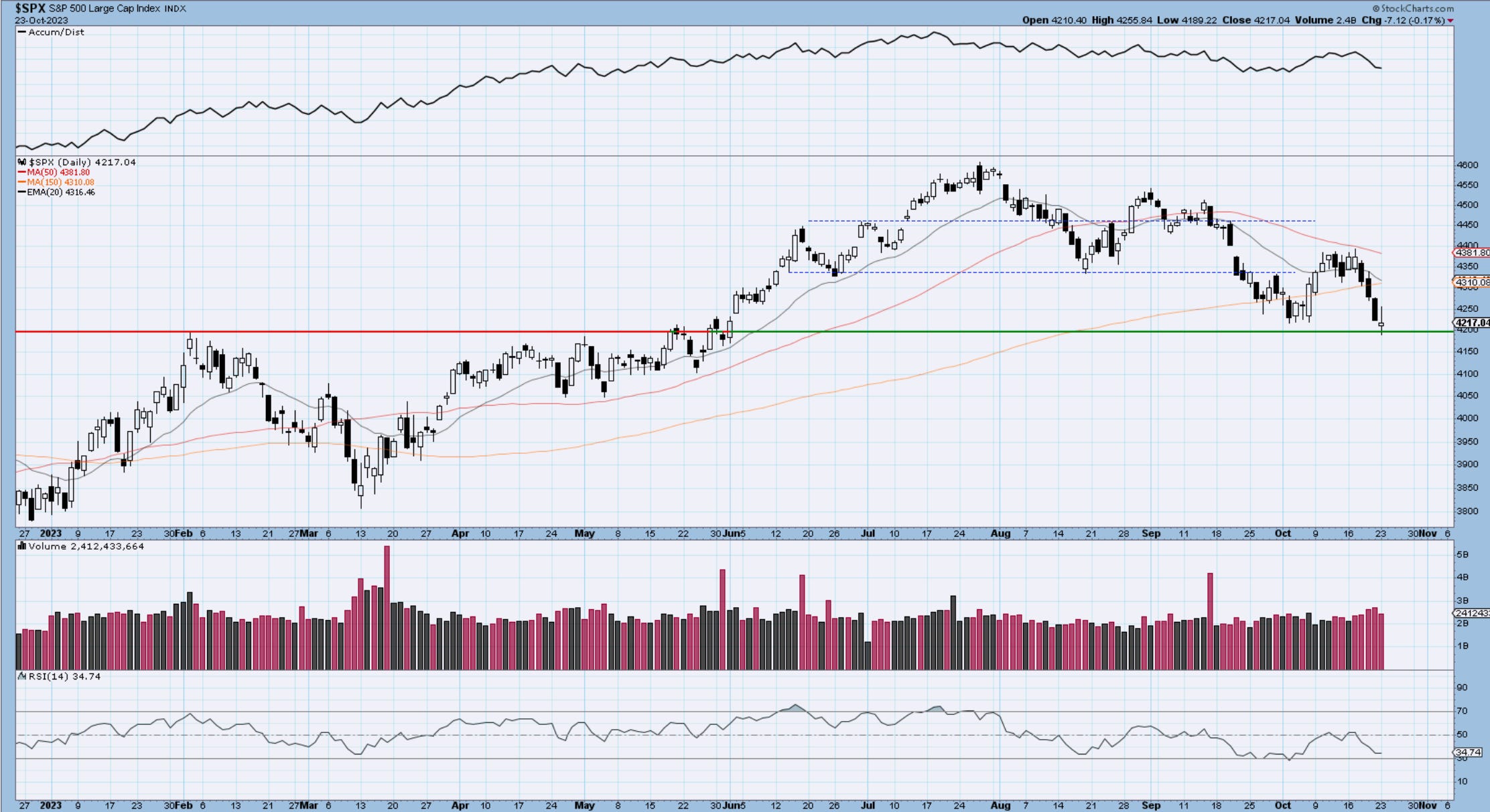 In the chart below you can see the massive support at 4200 and the attempted hold today. The volume and volatility have been obviously growing here as we’re into the last innings of October. Thr RSI has not entered oversold just yet and it’s actually a touch higher then early Oct drop.