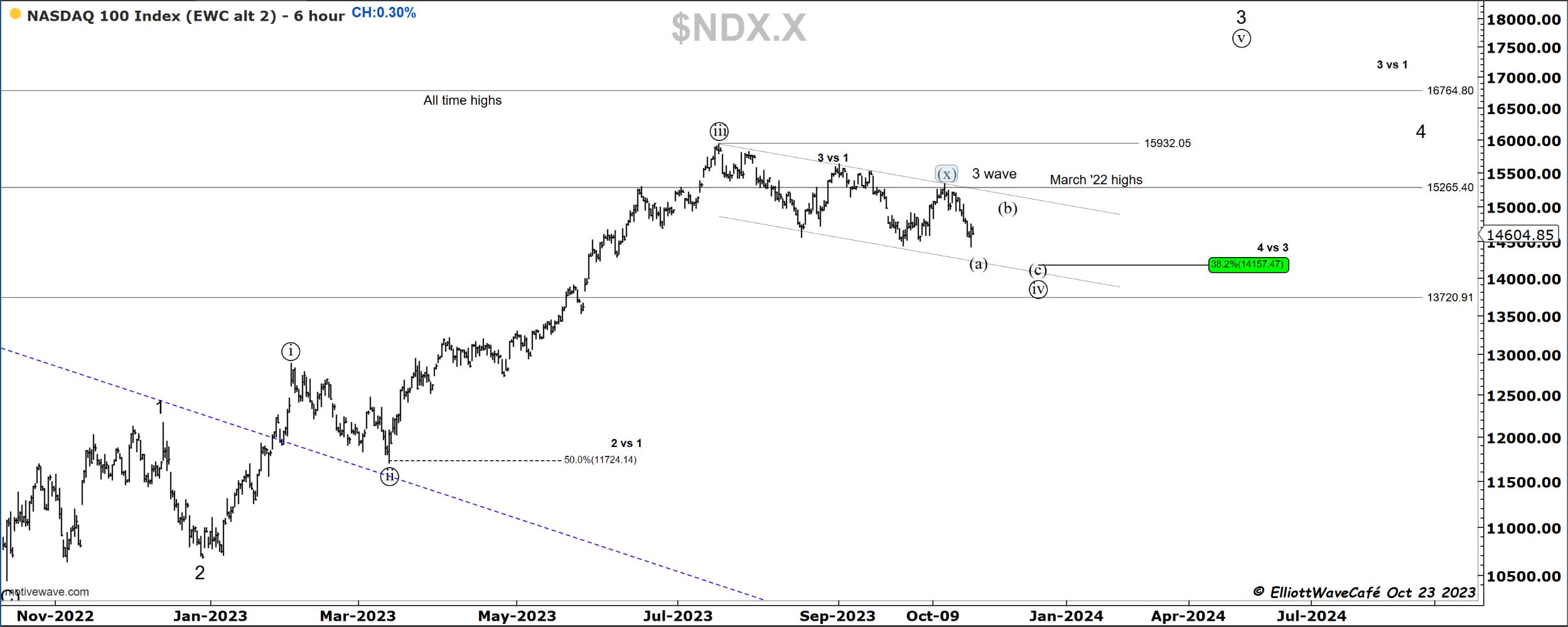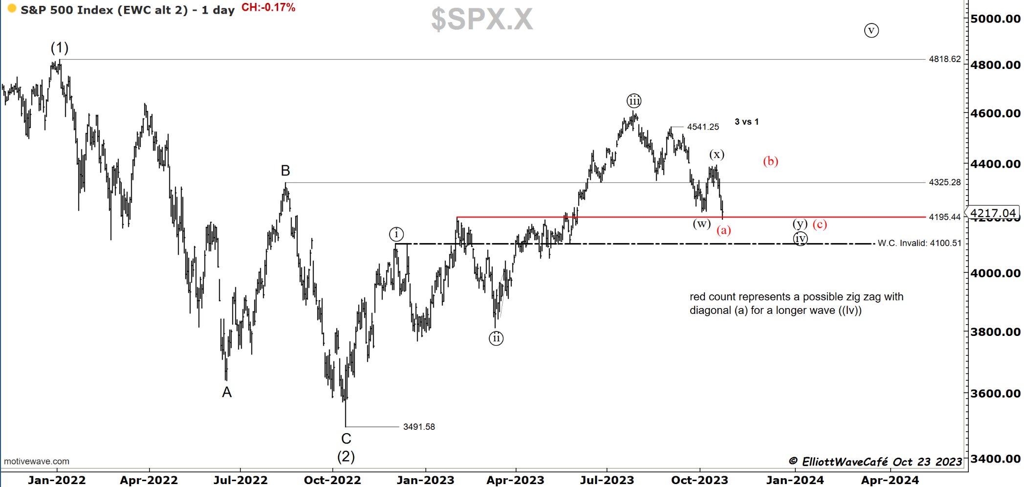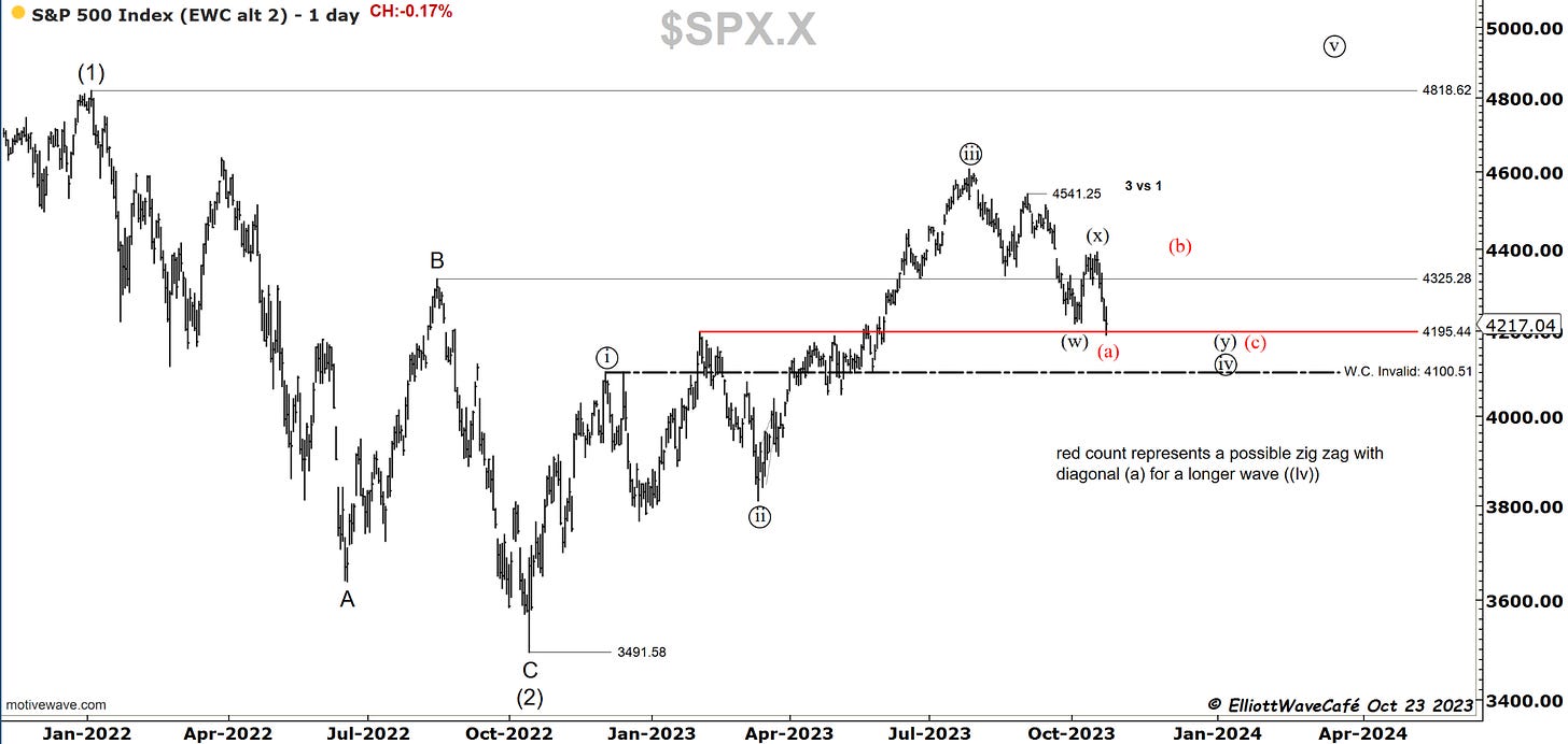 The Elliott Wave corrective count is now suspicious with the the drop below early October low. Under the ((i)) ((ii)) flat count, wave ((iv)) is still alive and deserves the benefit of the doubt. The only problem is that a 5 wave decline cannot be corrective, which means that to become one we need 2 more legs to unfold. Either b and c of an (y) wave, or (b) and (c ) of a zigzag with wave (a) being a leading diagonal due to overlaps. If you have missed my video on the SP500 from Saturday here is the link .