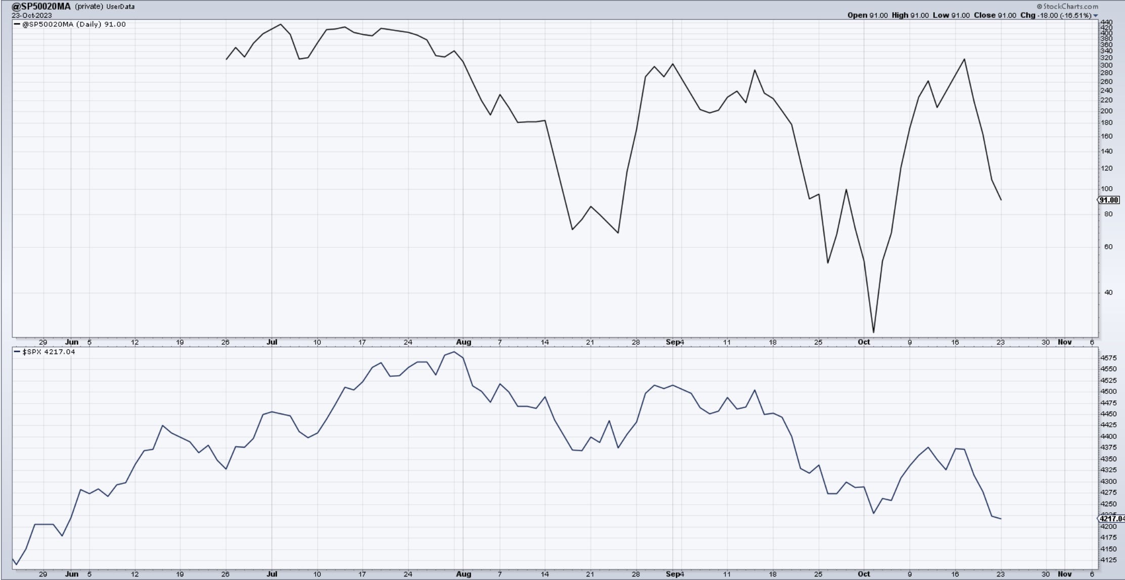 Pls take a look at the chart below that shows the number of stocks above their 20day MA in the SP500. Notice the divergence between early Oct low and now with the index making a new low. I think this speaks to underlying strength and refusal of some stocks to continue declining.