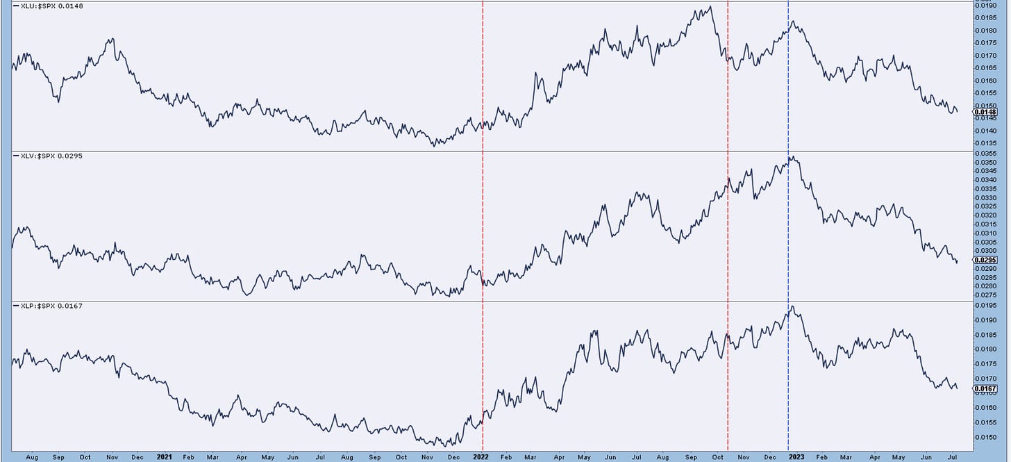 Three defensive sectors from the SP500 remain in relative downtrends, a further indication of Wall Street’s appetite for risk instead of safety.