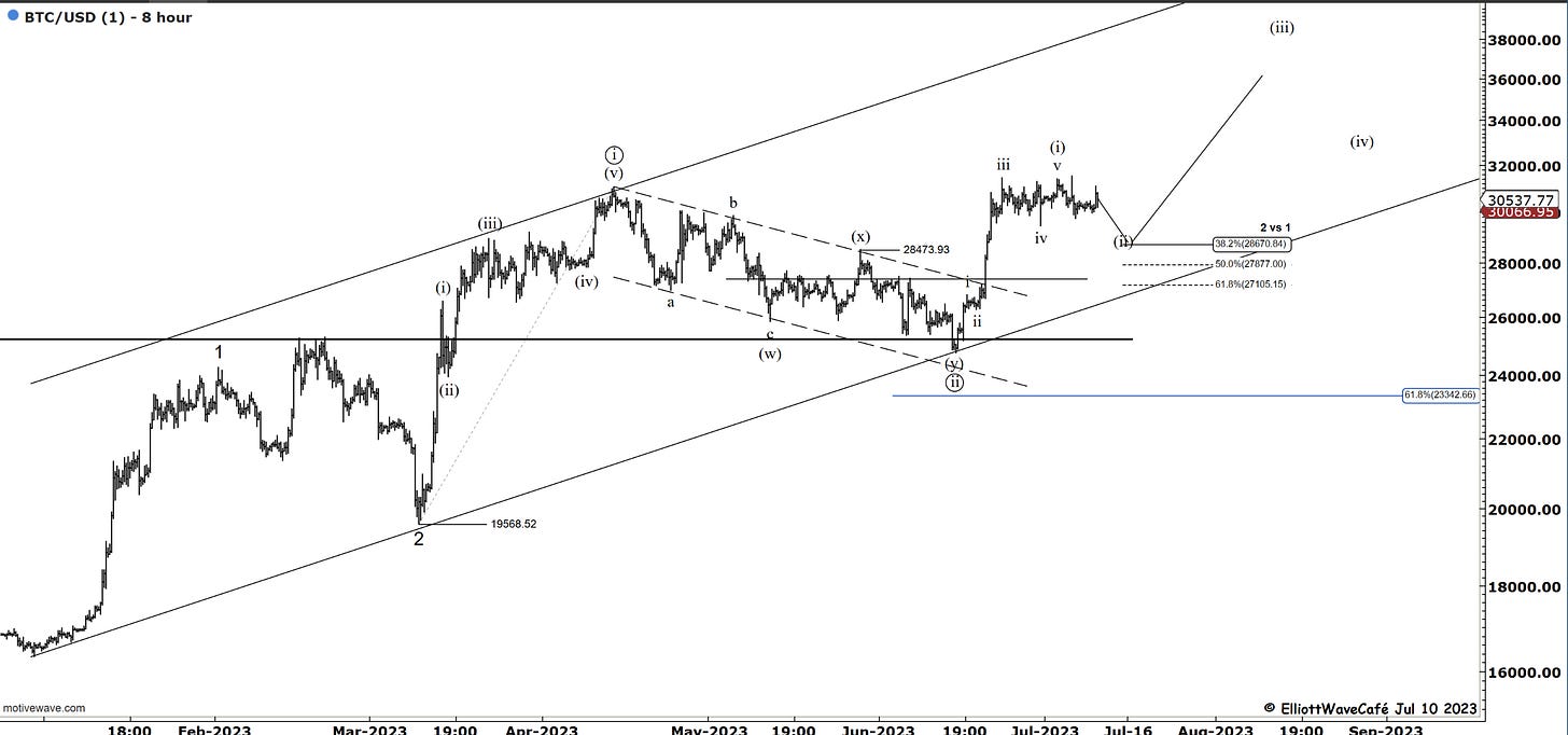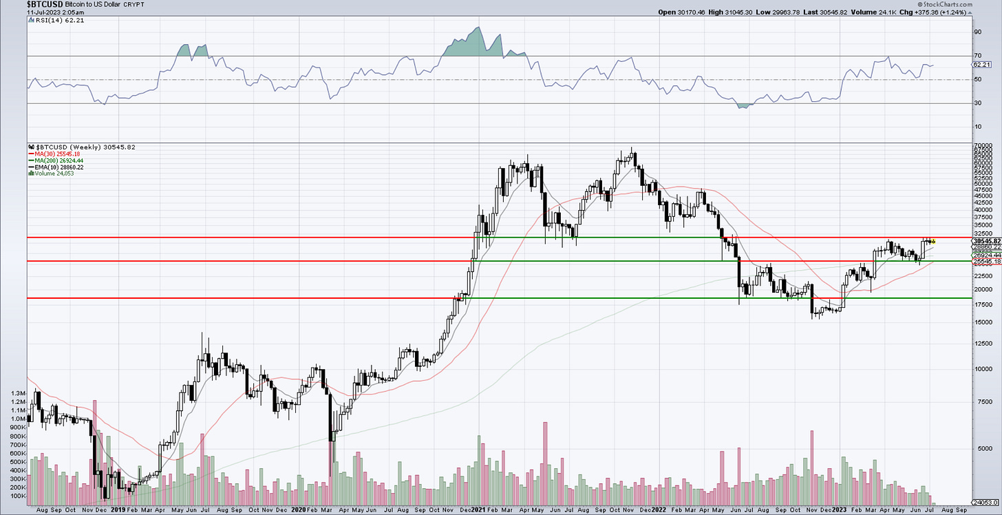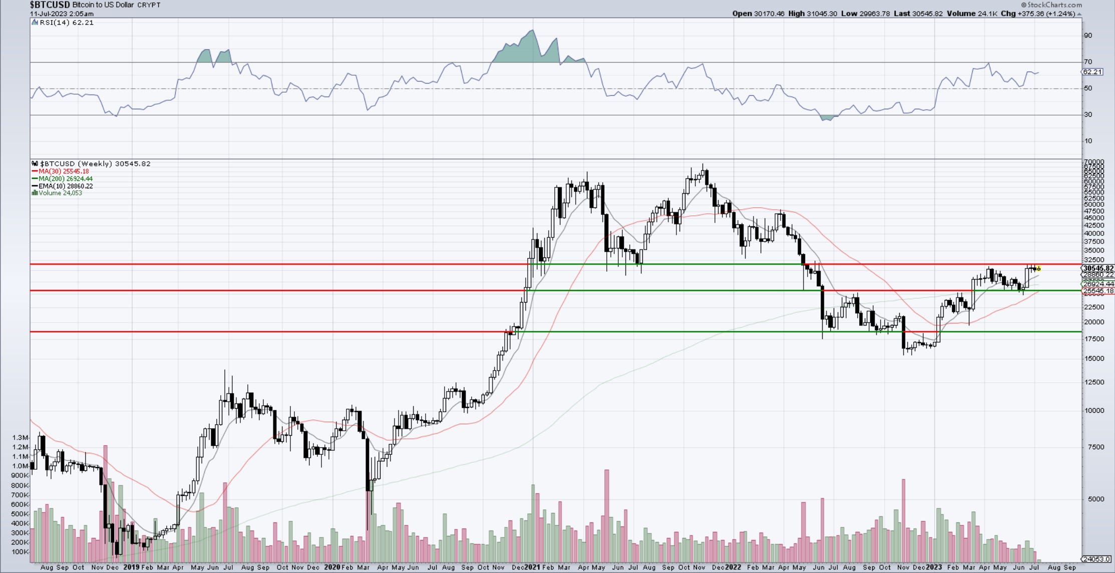 Is Bitcoin ready for prime time or do we need to wait for a dip into the fibs? It briefly tried but failed. The weekly chart below with the clear resistance level shows this is the 4th week of trying. One could start a small position in anticipation of the breakout, or wait for it to happen with alerts. Buy stops can be placed above 31,500 but be prepared for whipsaw and failures. It might not be that easy. But that’s the risk we’re taking. Long above 31,500 only or not long at all it’s one take. The other is accumulating multiple small positions at different prices as we retreat into fibs with stope below 26,500. Pick what you like and what fits you better. Just know the risks and get out if it does not work out as intended. This is the type of “financial advise” that you find here, not many services will tell you that.