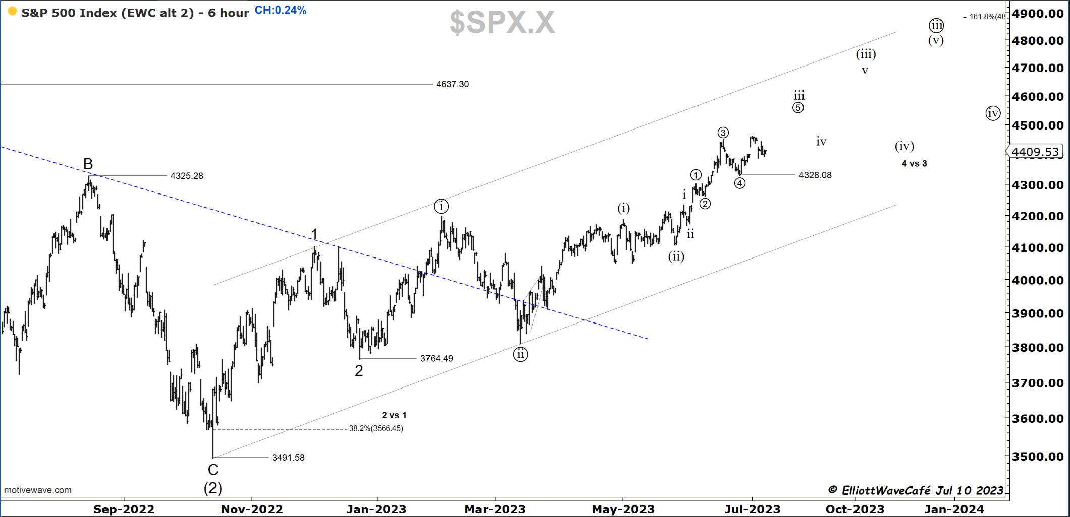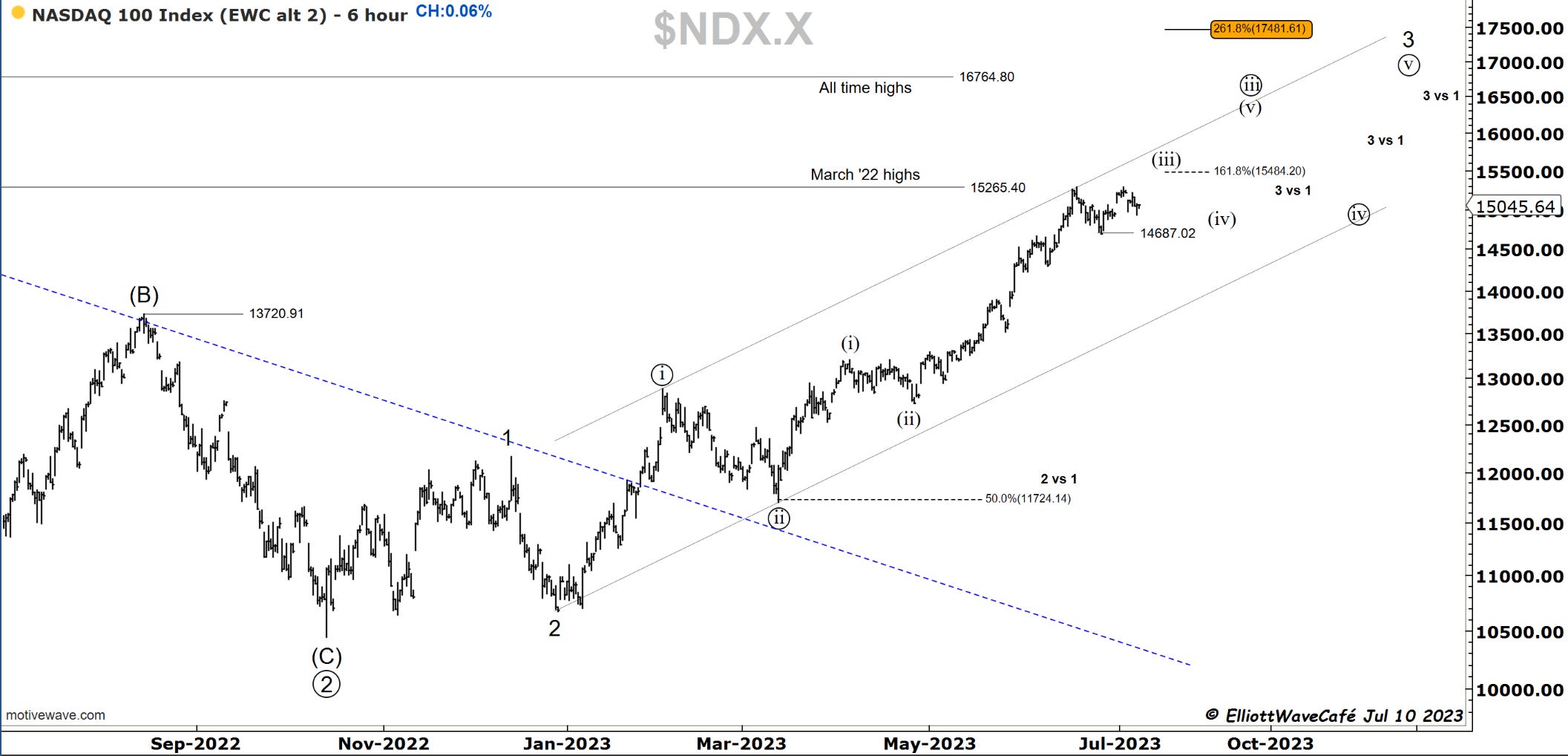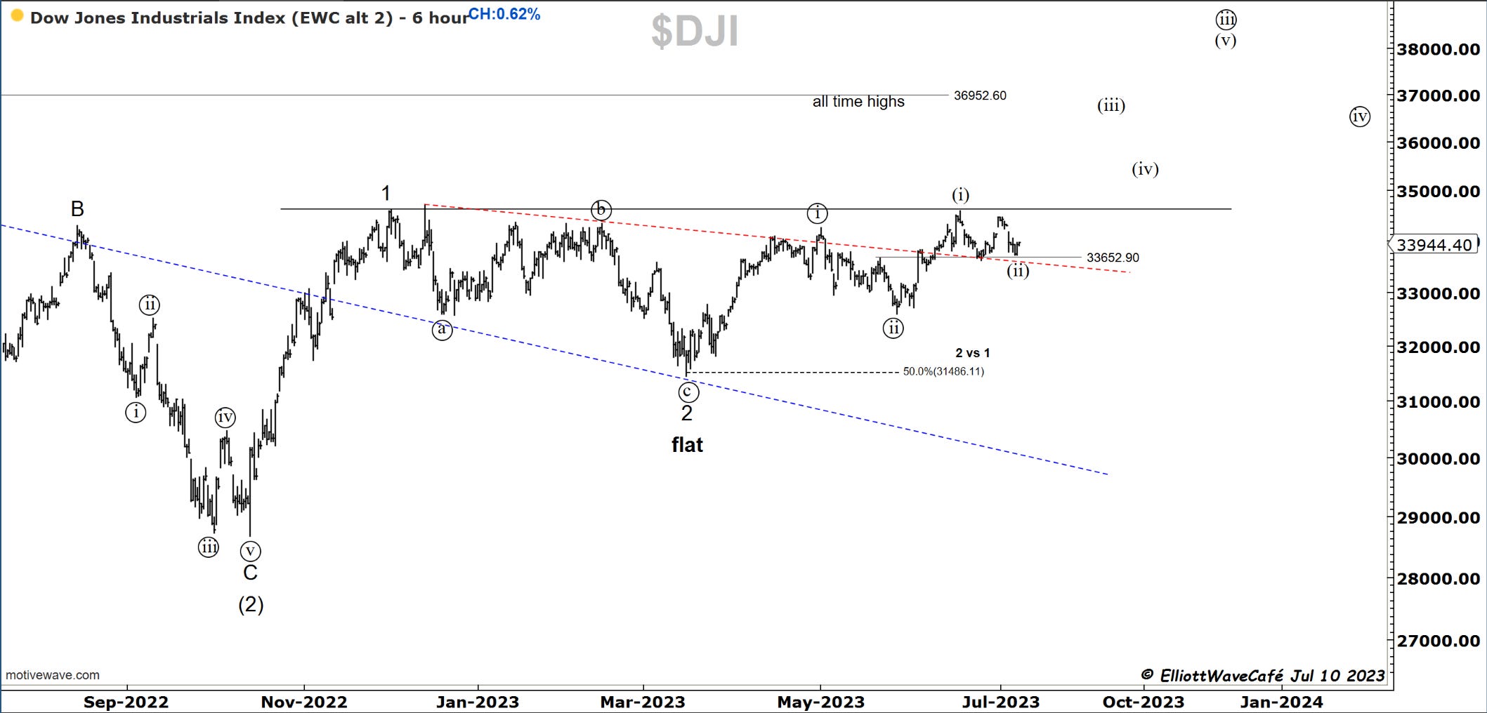 It seems that Nasdaq was weaker the last few days but the chart is not really showing it. We remain under the March ‘22 high, but if we overtake those, new ATH are just a matter of time. The count shows further upside but maybe at a slower pace. This is the best 1/2 year performance in the history of this index and the chart shows it.