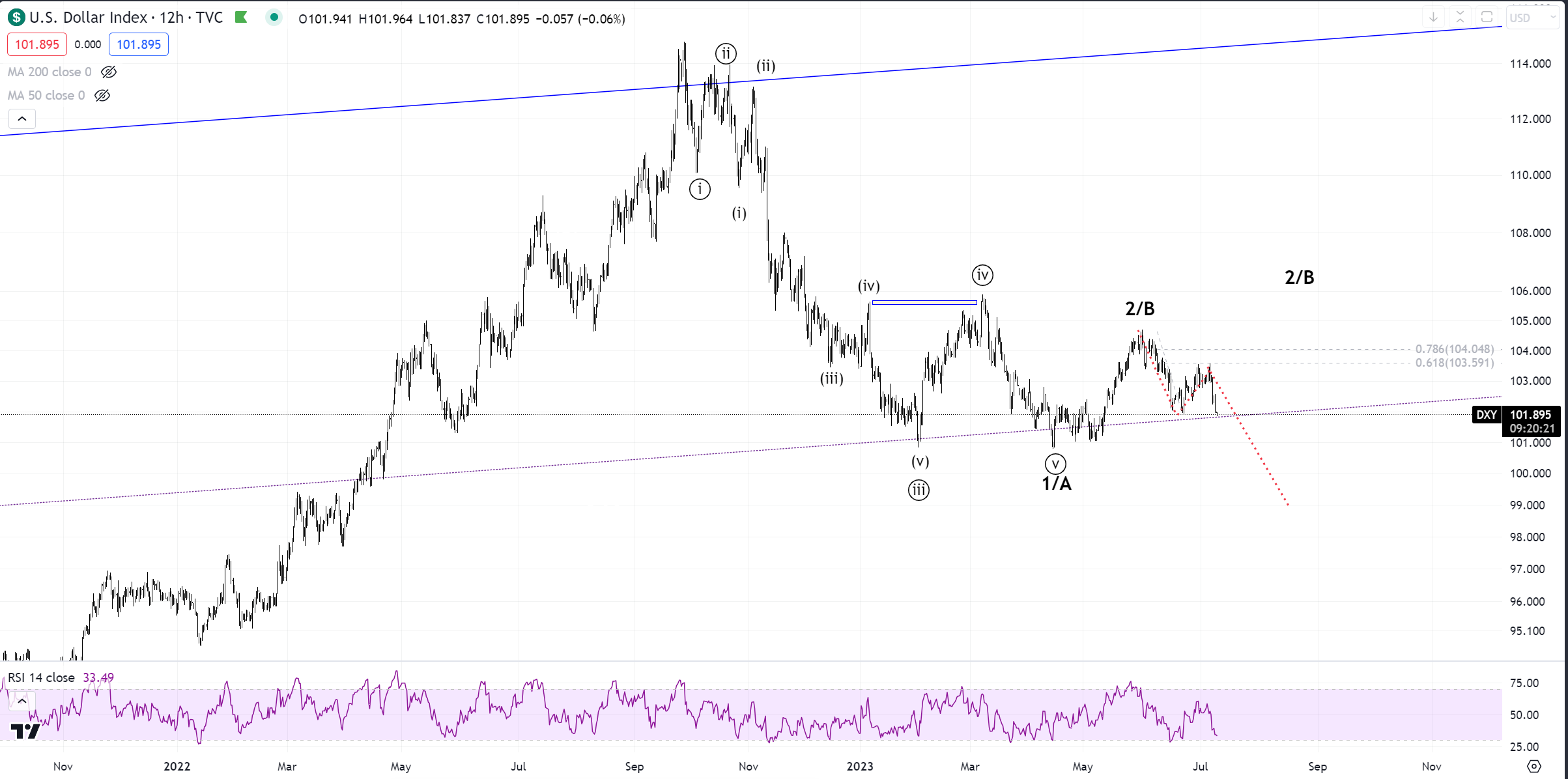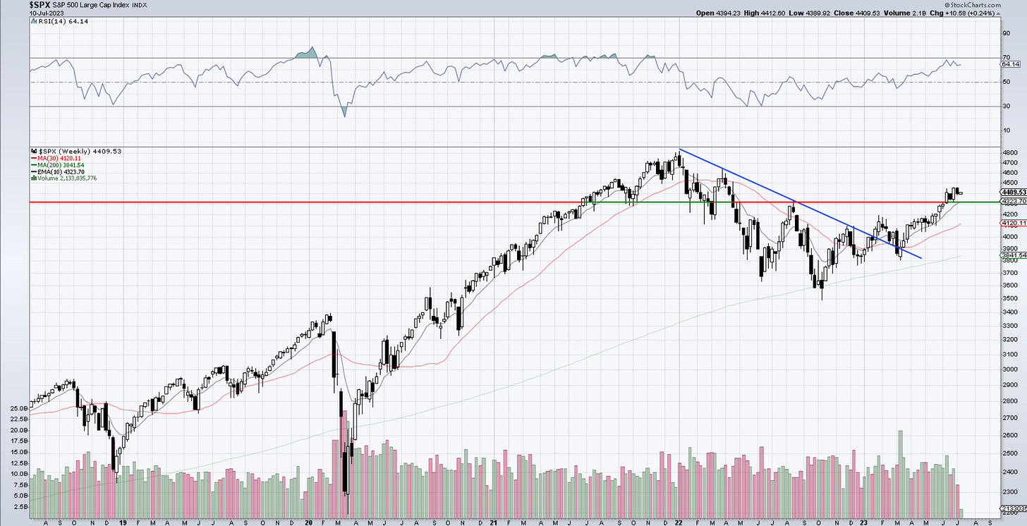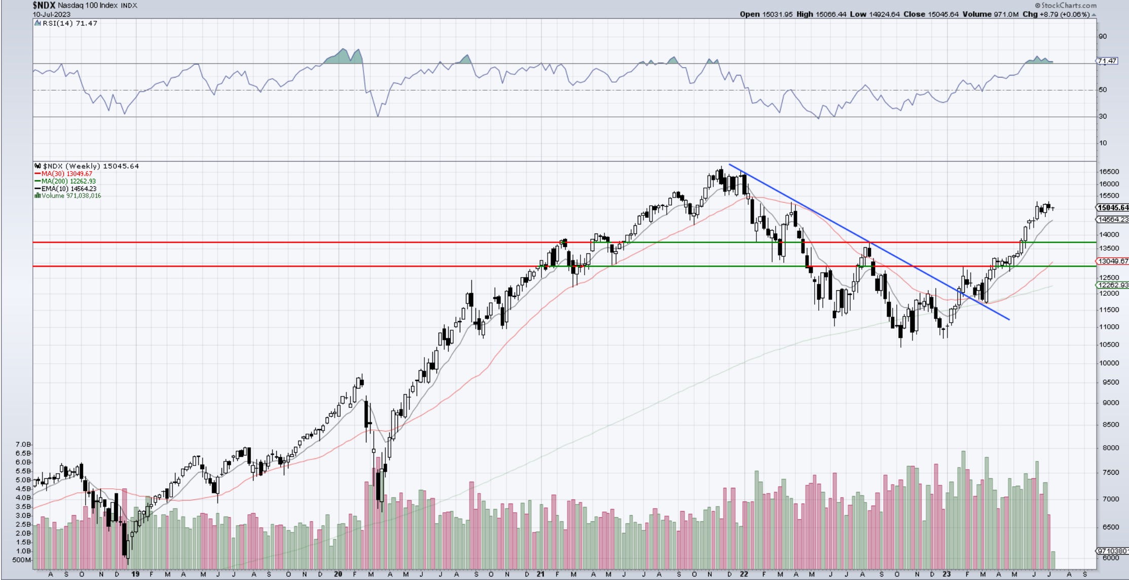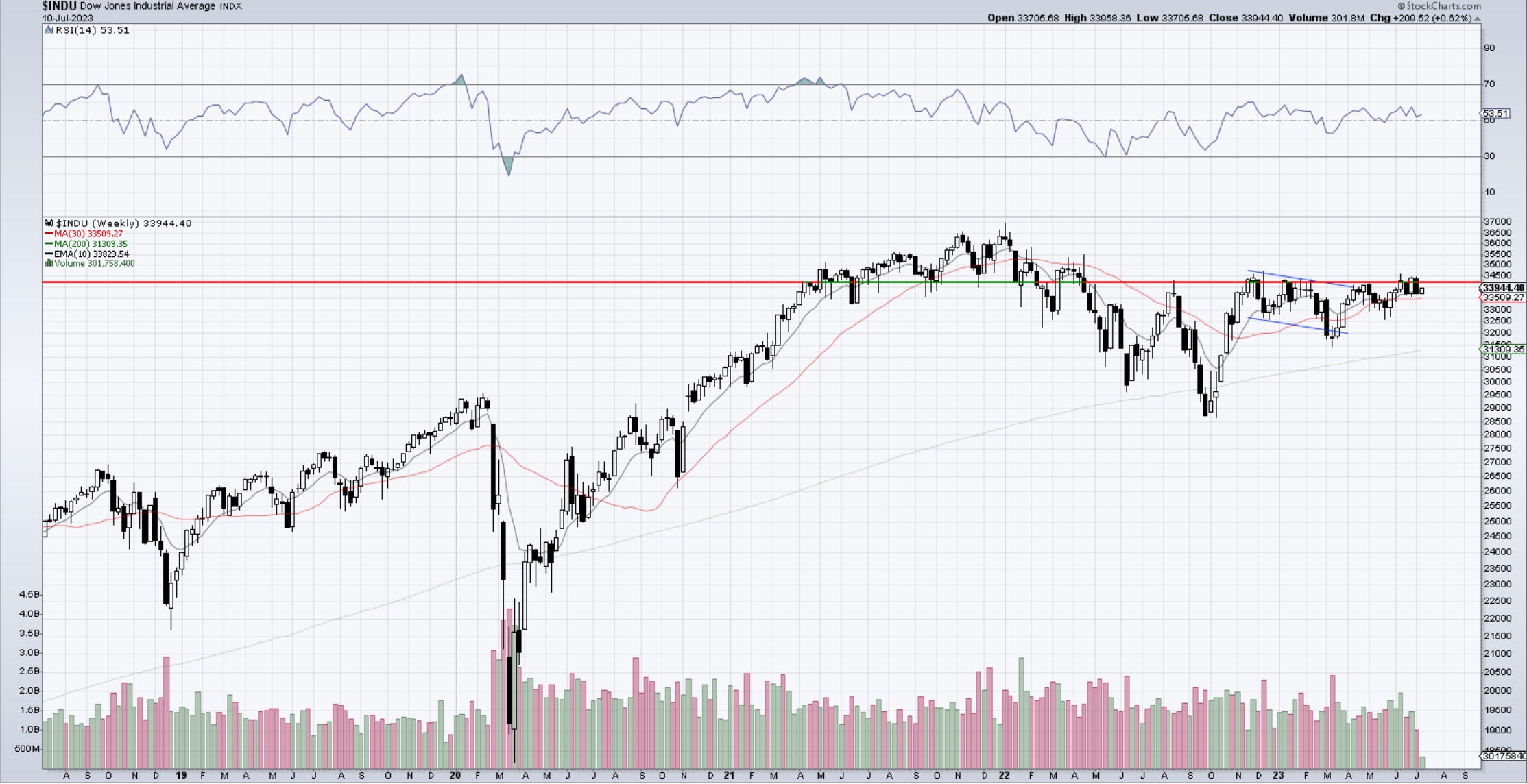It seems that Nasdaq was weaker the last few days but the chart is not really showing it. We remain under the March ‘22 high, but if we overtake those, new ATH are just a matter of time. The count shows further upside but maybe at a slower pace. This is the best 1/2 year performance in the history of this index and the chart shows it.