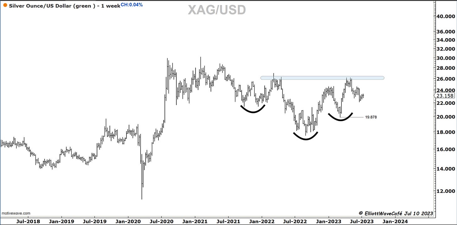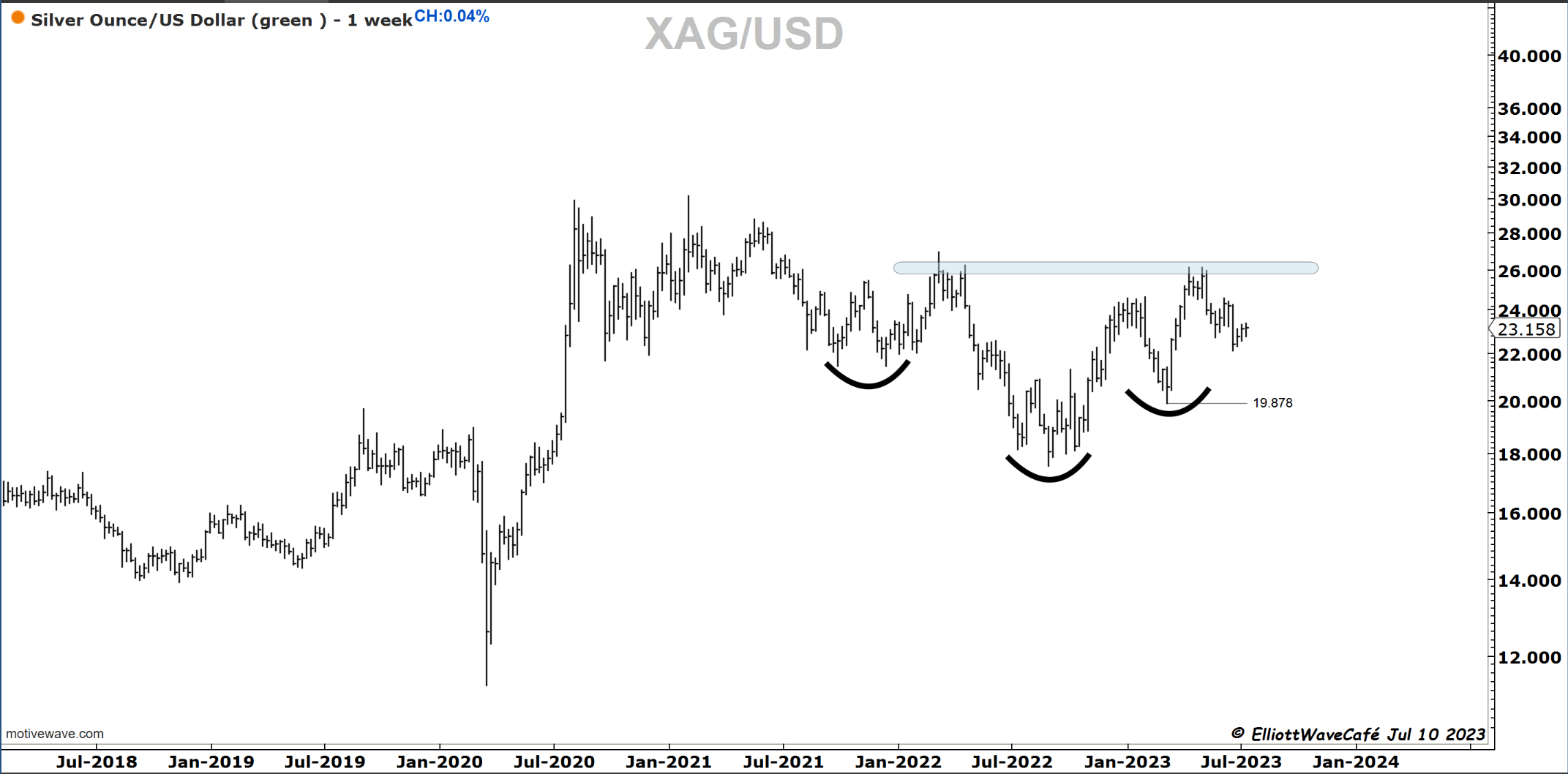 Silver did not continue the breakdown, and instead, it’s back at the top of the down trending channel and old declining trendline. Above them, I need to be bullish. The lower chart shows the inverted formation with $26 neckline. I need to see a bit more, but I am listening closely.