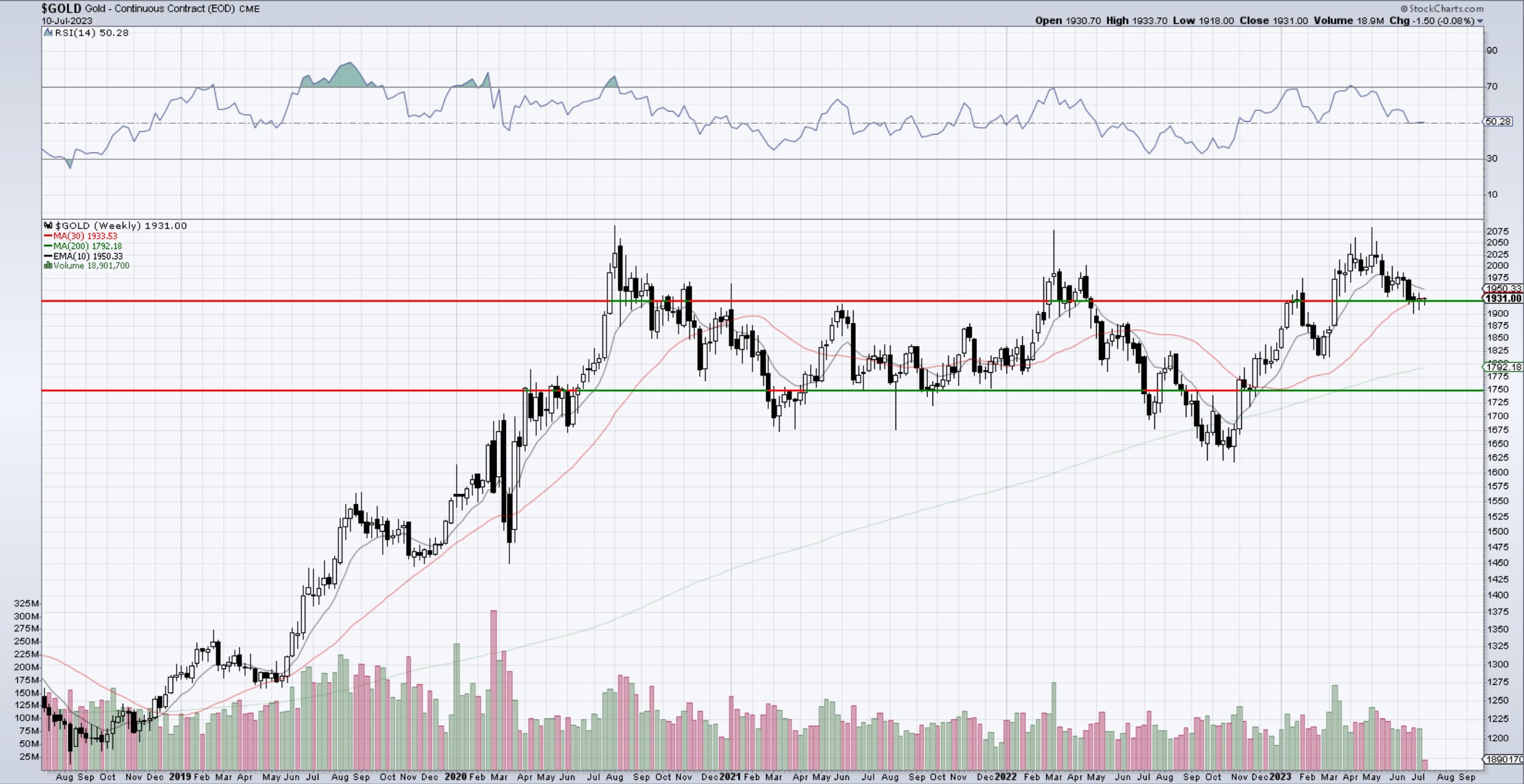 Gold made back some losses from last week, but it’s still undecided. The weekly chart below shows the horizontal support along with a rising 30week. We just need the price to respond. The break down in the dollar should definitely help if sustained. A rally towards 2k would ensue.