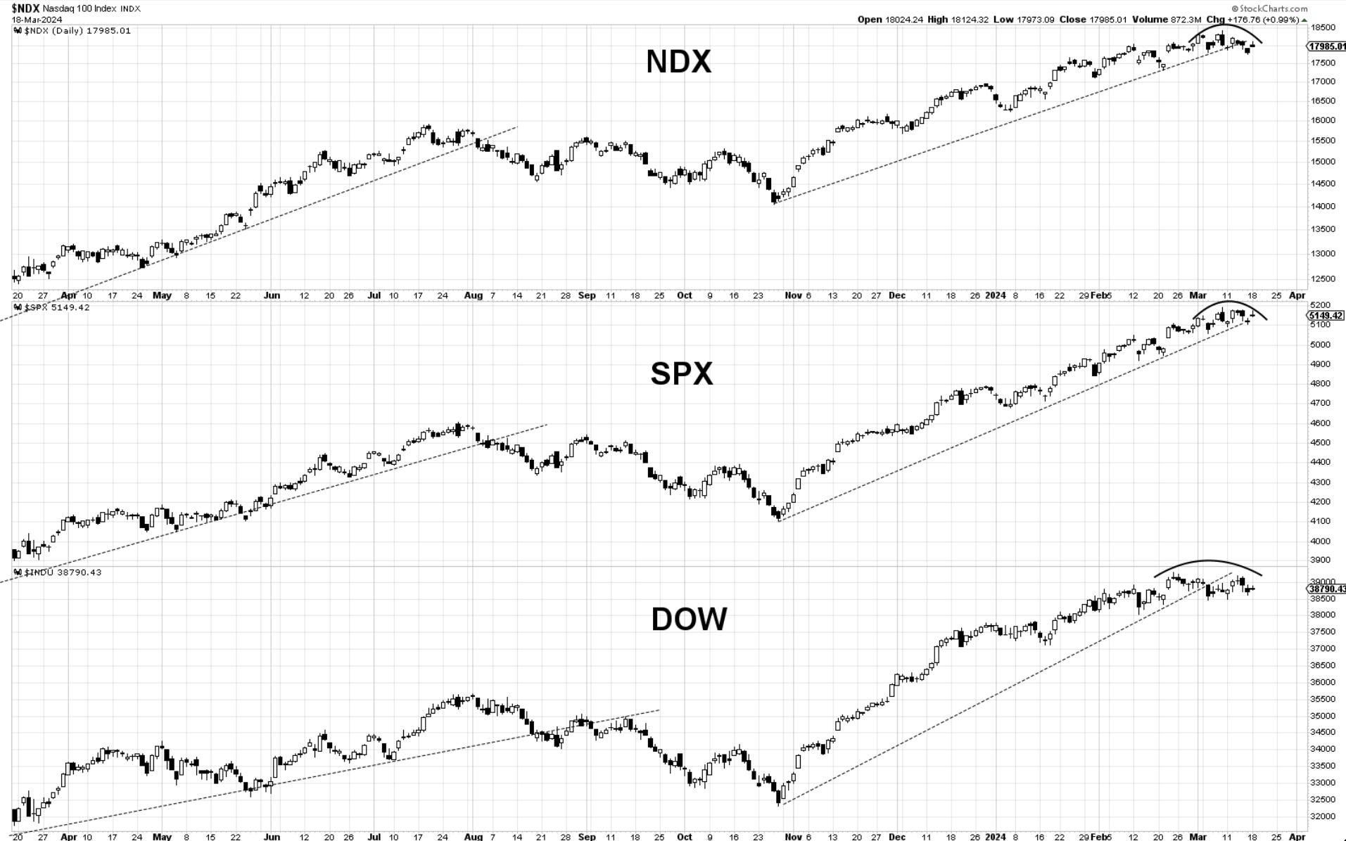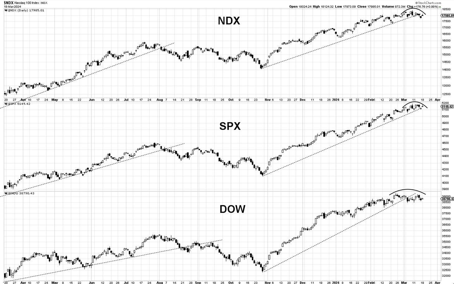 Chart of the Day - Combo NDX,SPX,DOW. Markets have been stalling since the start of the month. Trendlines are having trouble supporting the advance. It is not a bearish signal just yet, but something as simple as this can hint at changes in price behavior.
