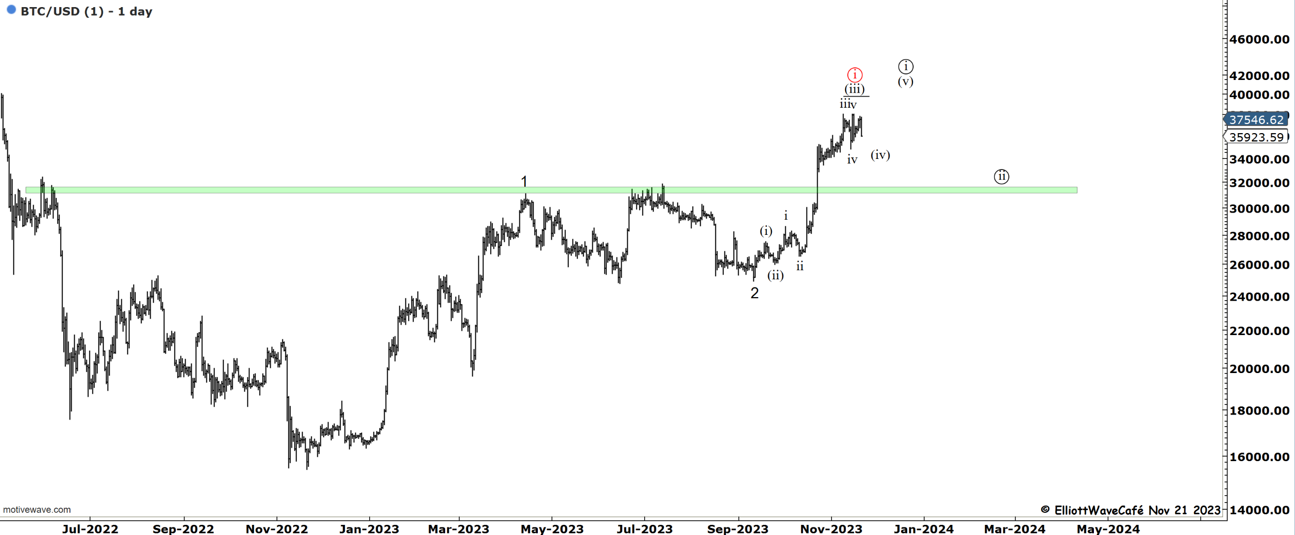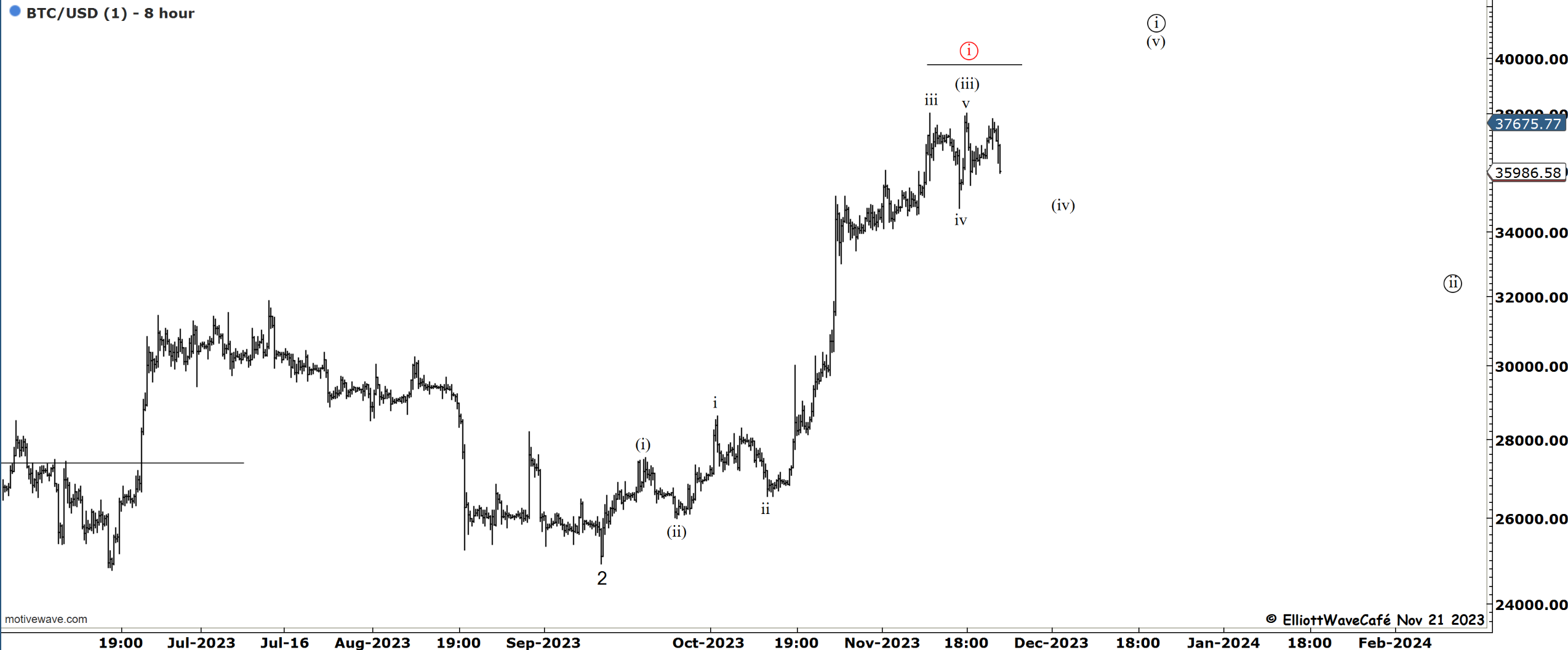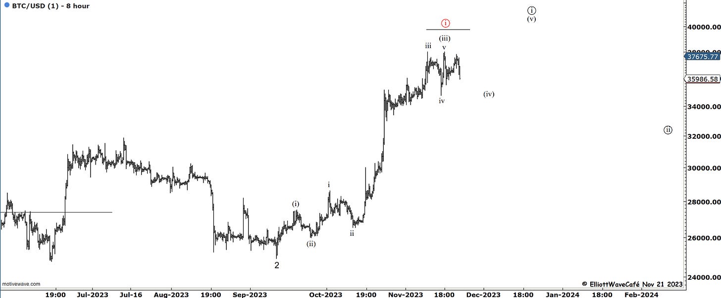 In terms of counts, I still maintain the outlook we’ve been having over the past several weeks. We are in wait and correct mode, cycle, and seasonality. There is a slight chance wave ((i)) has already been completed, but I reserve the right to keep that as an alternate at the moment. A break below 34k, would likely secure it. The larger pullback, if realized, we’ll take us to the 30-32k zone.