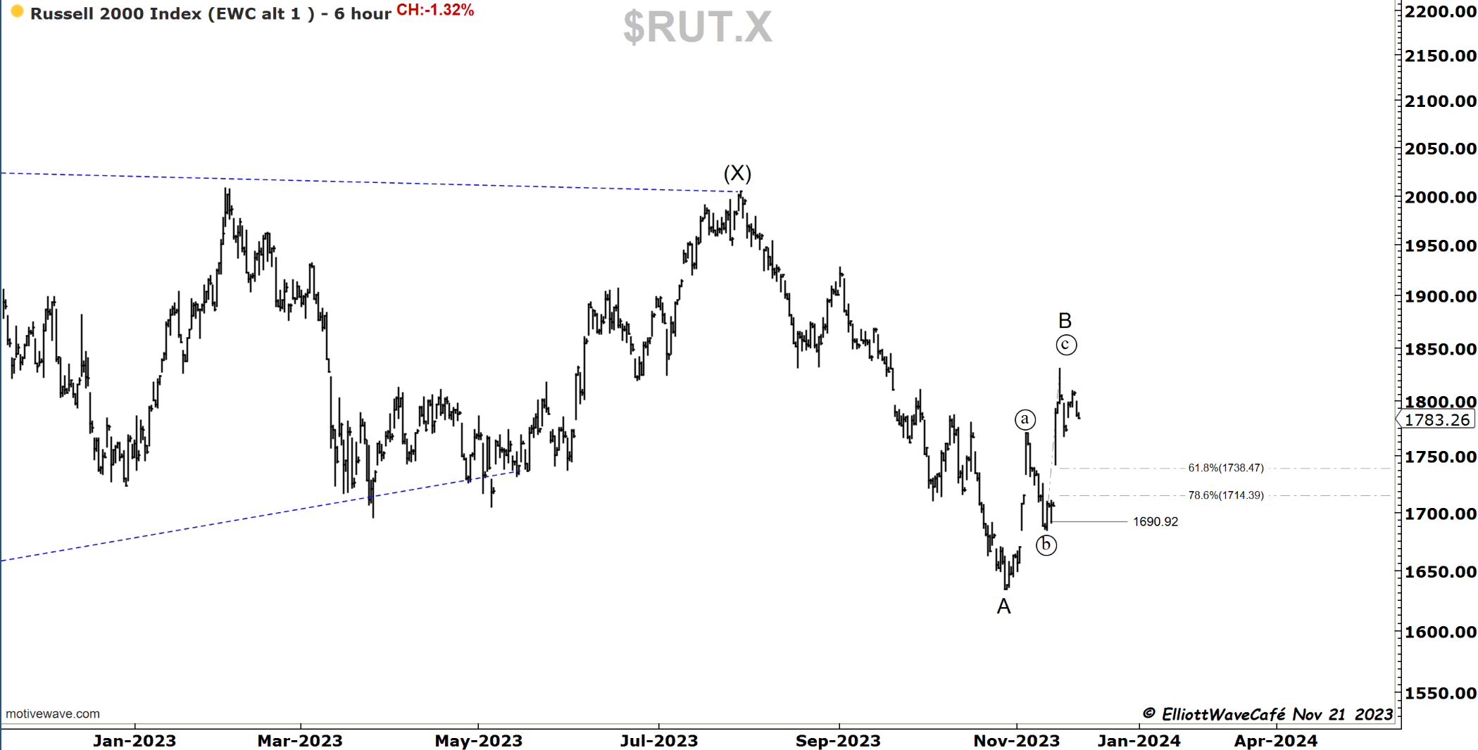 On a weak day once again the small caps were the hardest hit. Will this index continue to disappoint investors? If it’s an ABC countertrend in B, then they have no idea what’s coming next. Those fib zones shown need to hold, or else we go much lower.