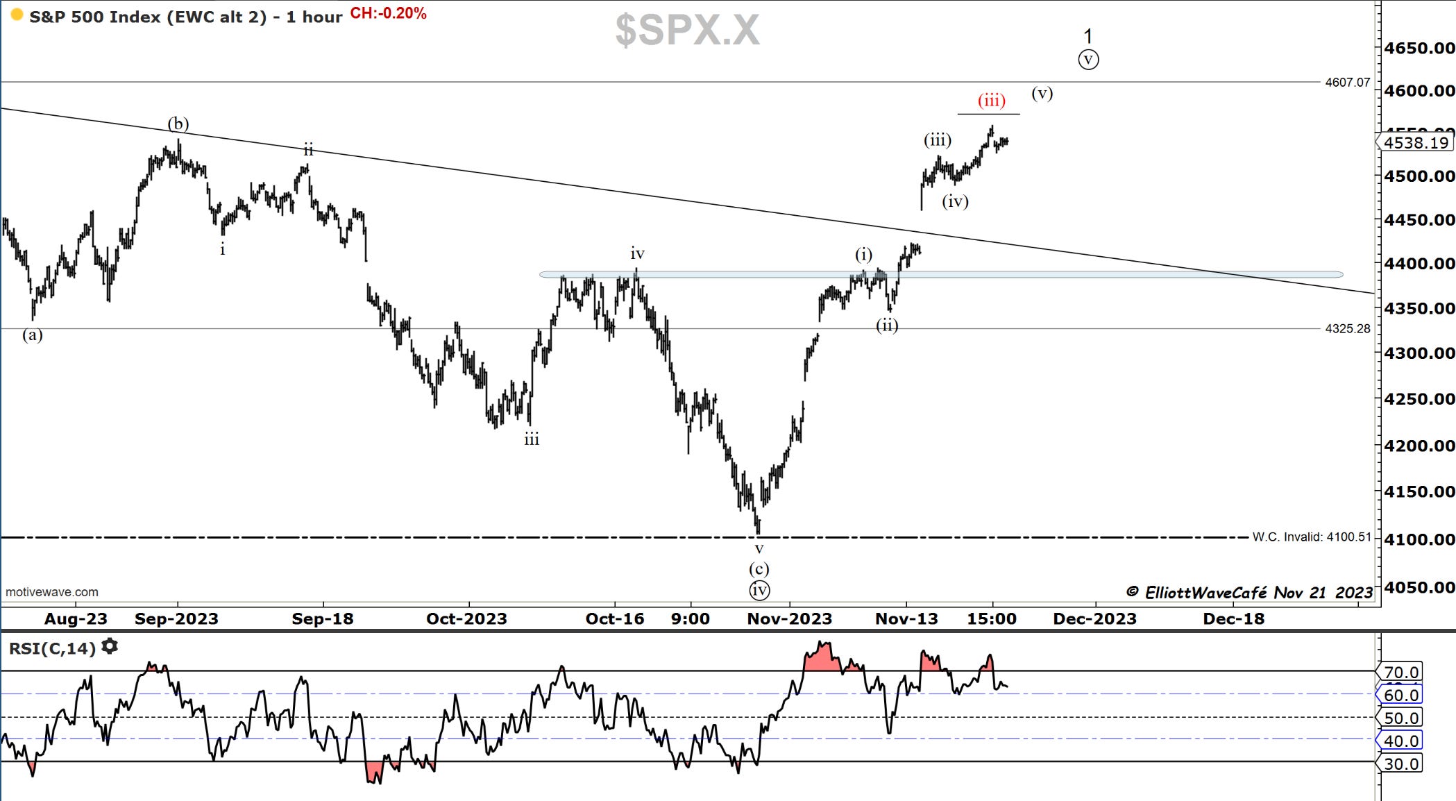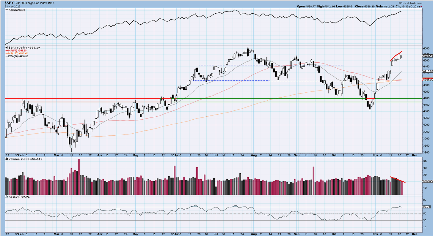 It takes more volume on advancing stocks vs declining stocks to sustain the momentum higher in this market. That has been falling for the past couple of days. The regular volume has been drying up as well. It could have something to do with the US holiday, but that’s how corrections start. There is a chance we have to complete one more 4th wave and another push higher in five, but the road is approaching its end. It will lead to a correction towards 4400 in the SP500.