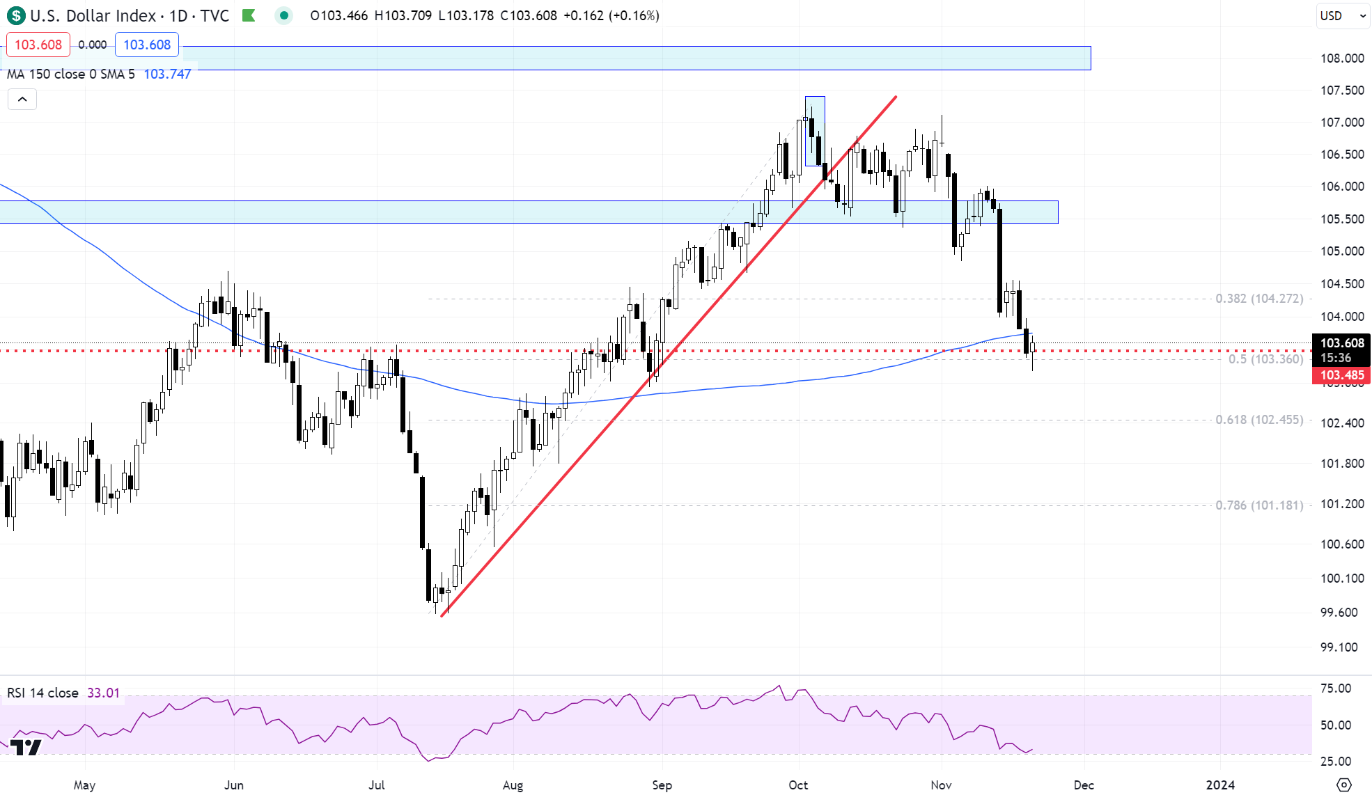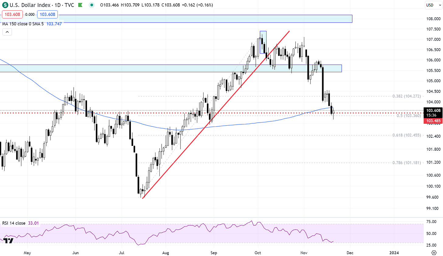 Ever since the dollar broke that trendline, with little consolidation delay, it was a roll over. We are trading at 103.50 and are just at the 150-day MA. It’s also a pretty major horizontal level for the greenback so I would be cautious down here.