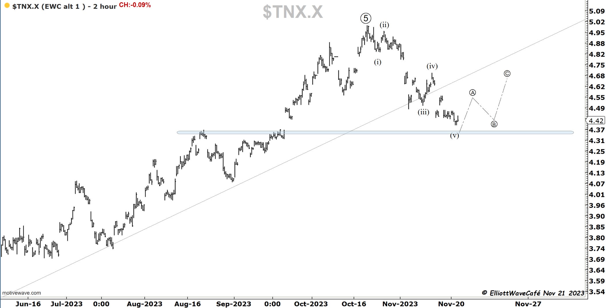 Looking for 10Y yields to start finding support near 4.35 zone followed by a 3 wave setback.