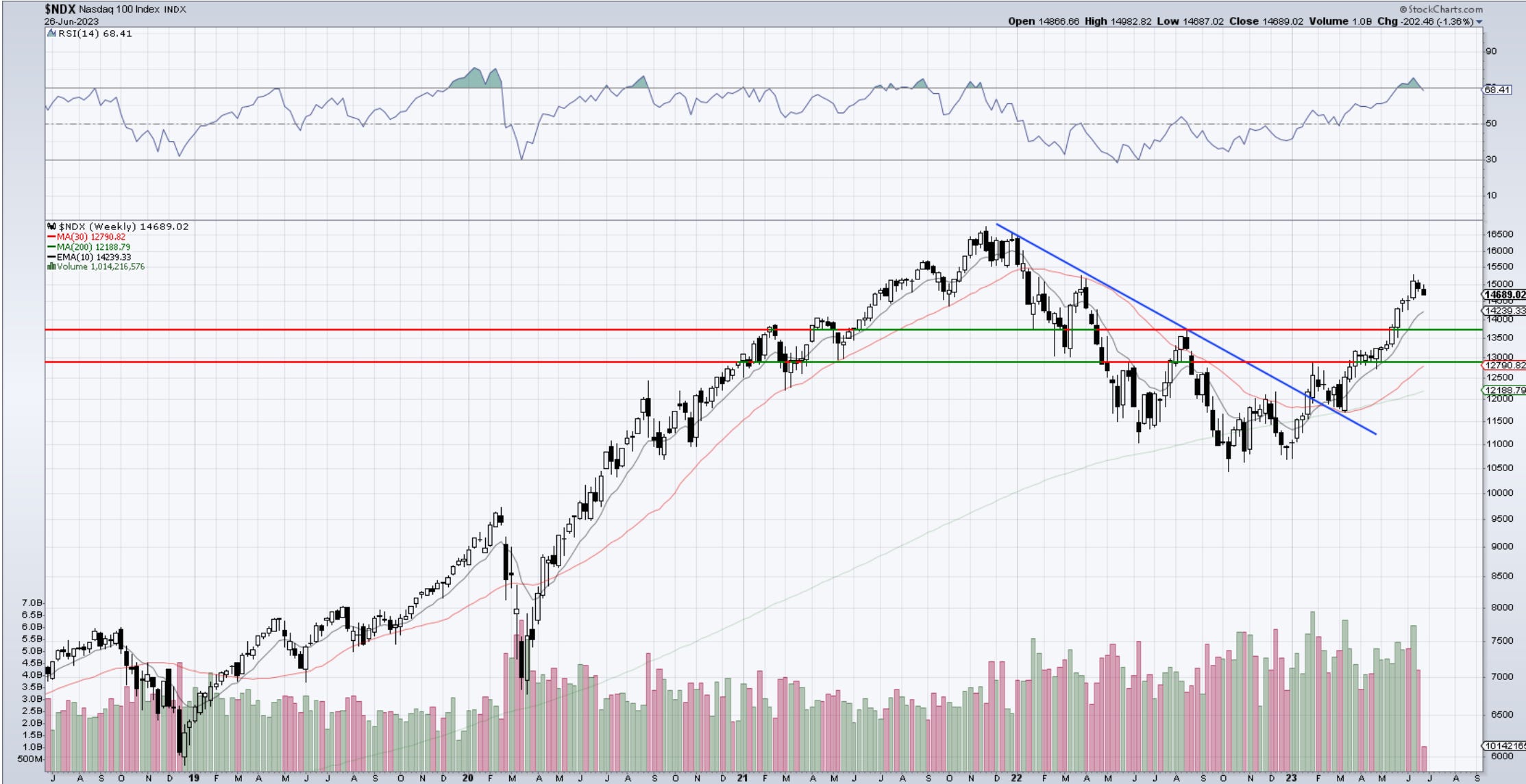 Nasdaq is sitting just on top of the prior swing highs. There is a lesson on horizontal levels on the site. I think there is a high chance that we hold here and we bounce. How high we will see, but we continue to follow the count. Daily is also tapping 20day. We’re on a clear 3rd wave impulse on weeklies. Tomorrow we will likely add TQQQ to active positions.