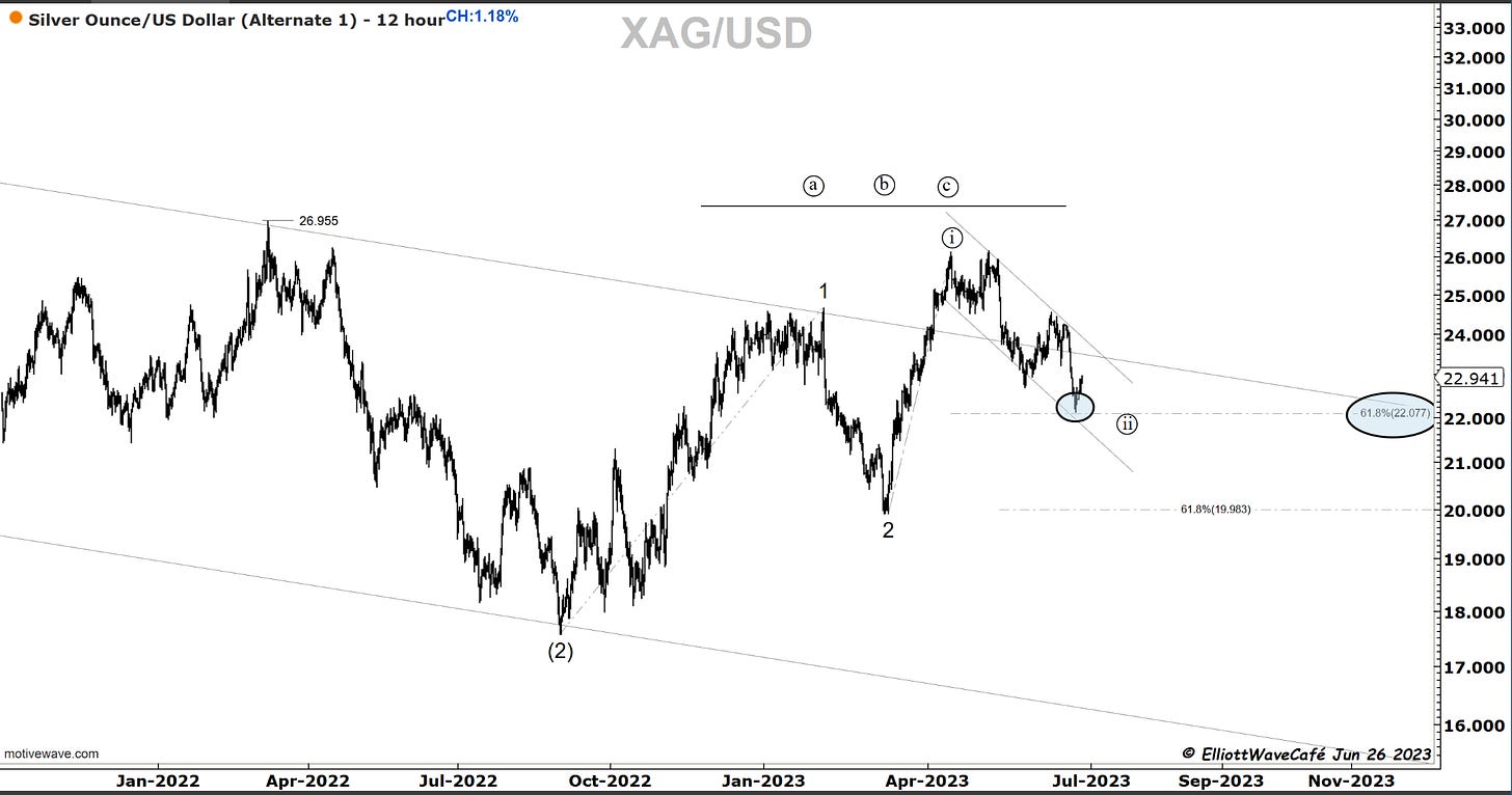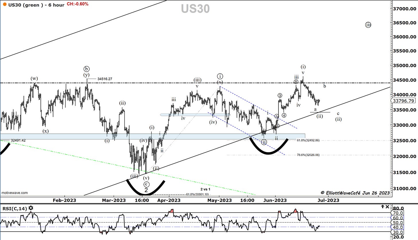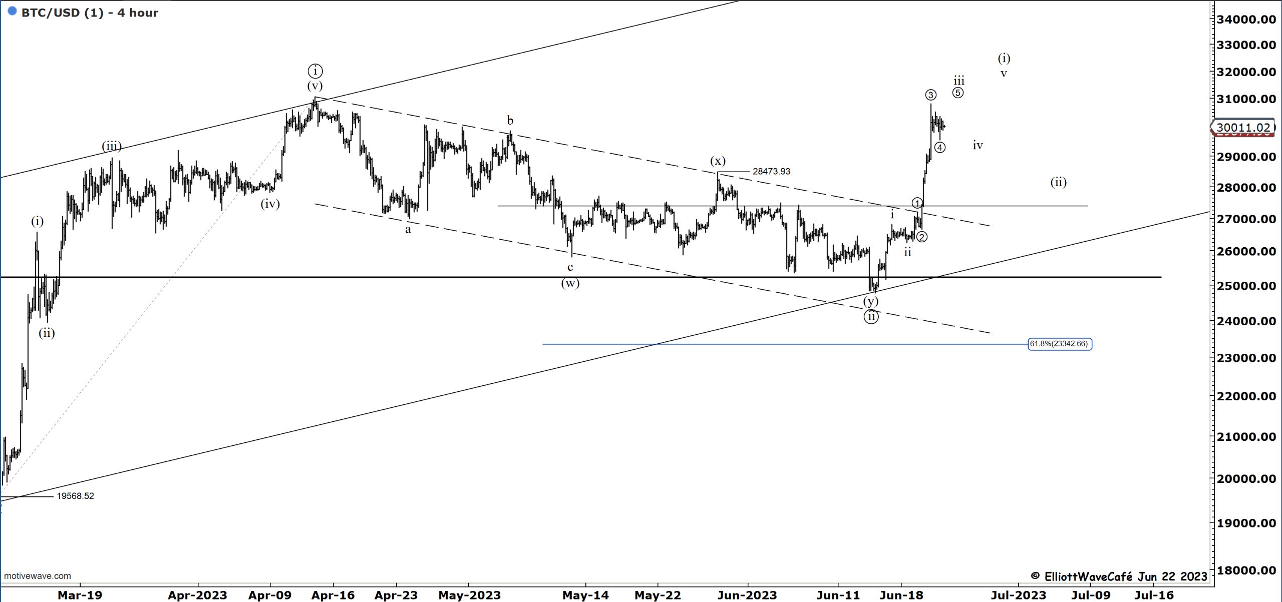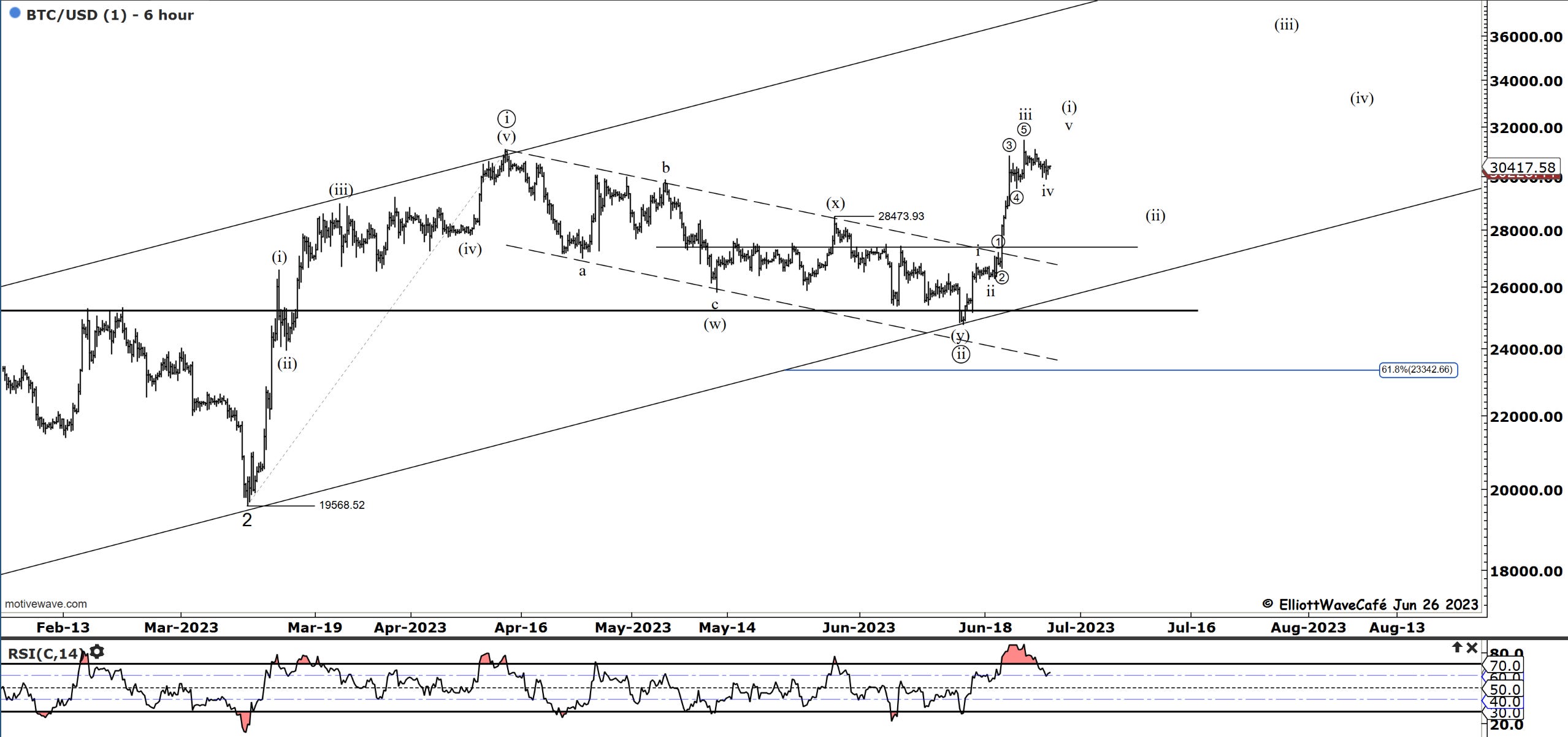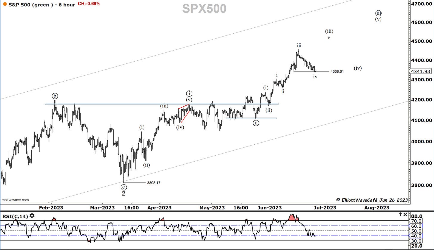 The script was not that hard on these latest few waves as you can see from the June 22nd chart below. We were missing a 4th and 5th which we completed, and we might still be missing another 4th and 5th. We would then expect a bit of a larger wave (ii), but there are no guarantees as to its size or depth. I will be starting to build a position for the next wave (iii) higher once wave (ii) unfolds.