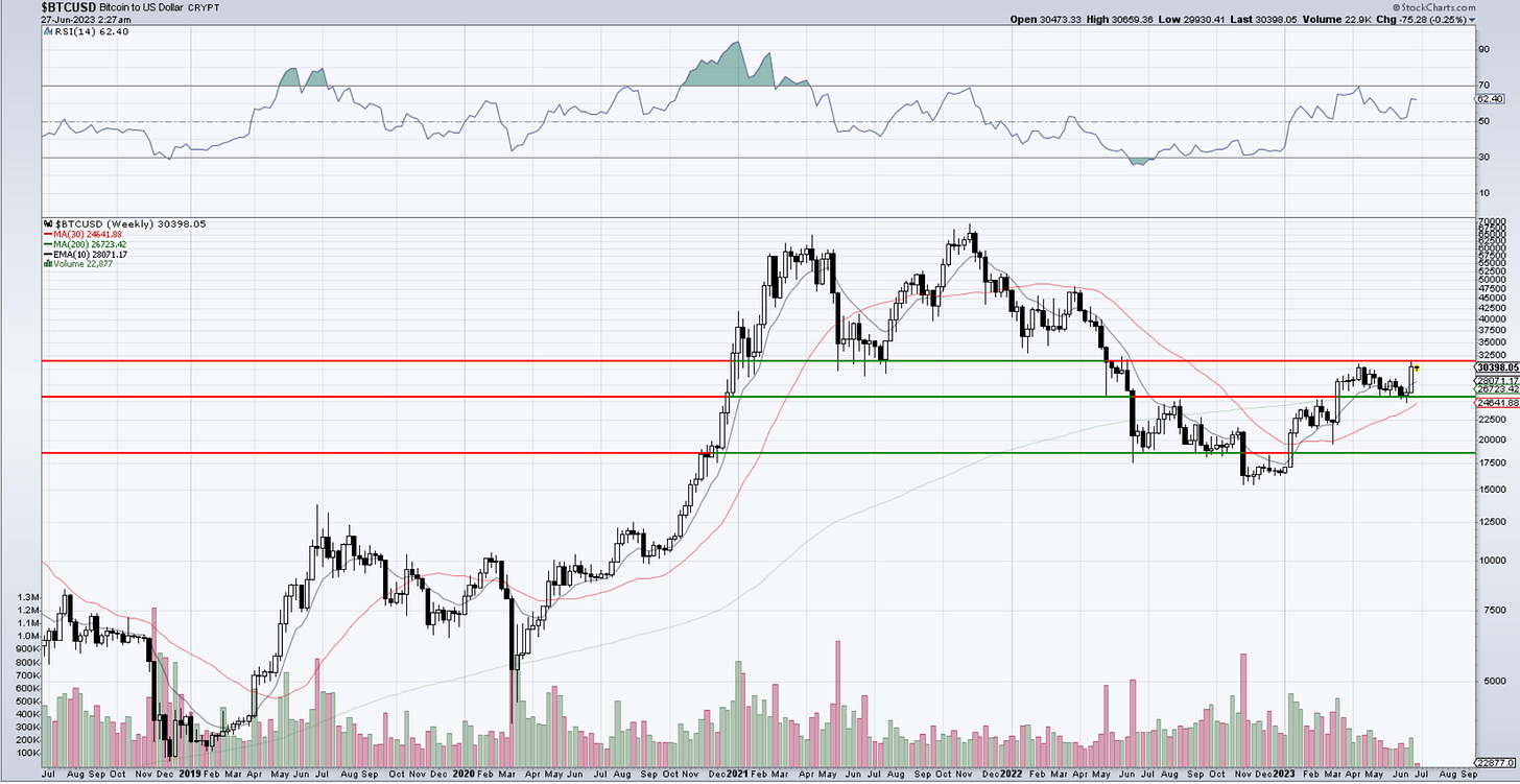 See the weekly chart below, above 31,800 there is not much holding this thing back until we hit 38,500.