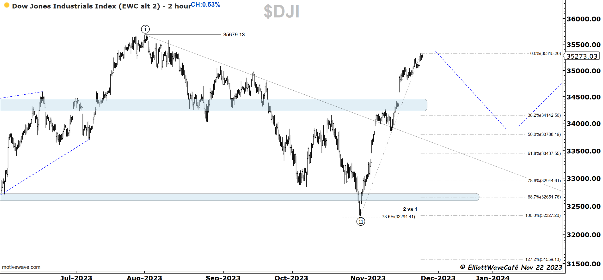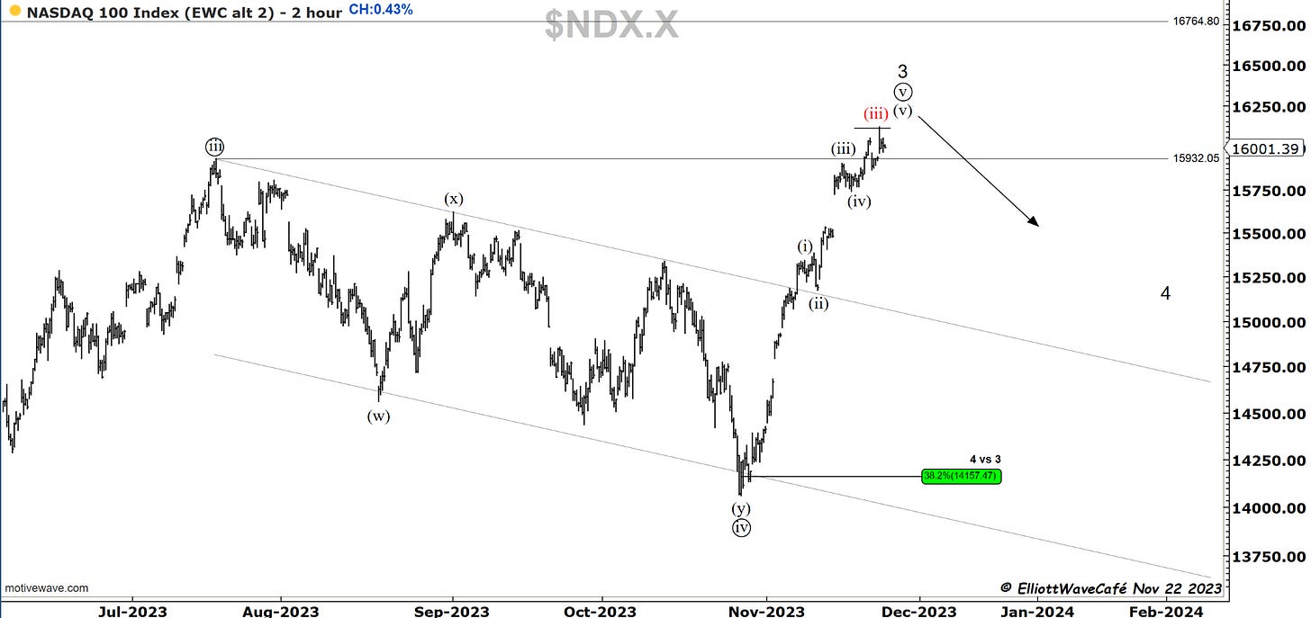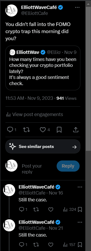 Since that last thrust on Nov 9th, we went nowhere, but it seems that we crashed and rallied a few times over. The sentiment was frothy back then and it needed to adjust. Maybe it has already. I don’t have the same edge on reading that sentiment anymore, so I will refer to the EW counts for the time being.