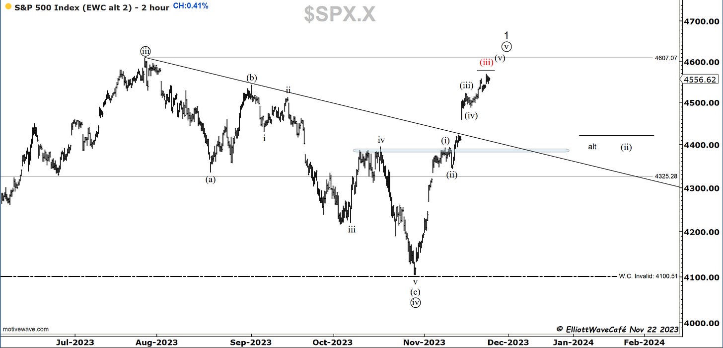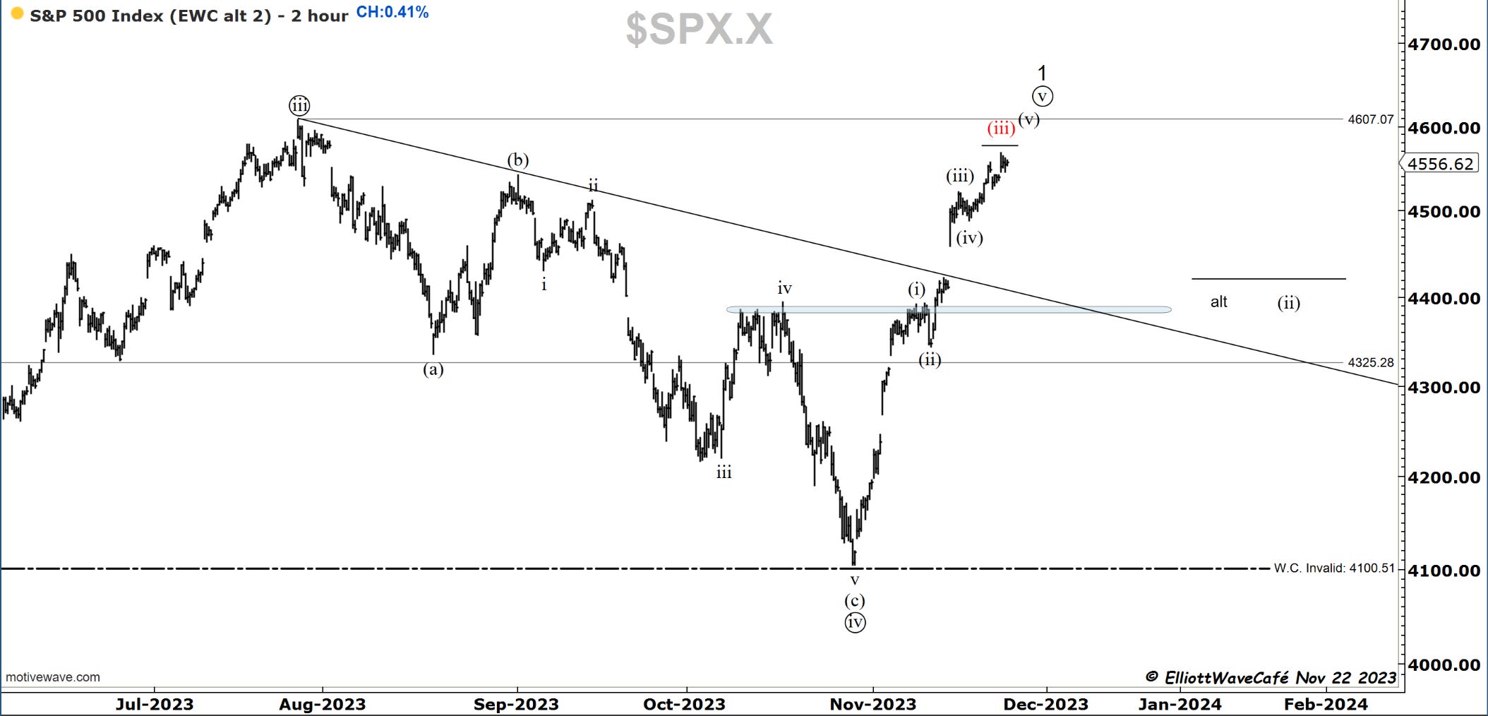 A slow meltup higher today on low volume as US traders are marinating the turkey. Let’s see if she can hunt that 4607 before Nov ends. The advance is slowing down but there is no actual price evidence of a turnaround yet. I remain on high alert for that scenario and will press short bets once the opportunity arises. A standard EW approach is to only short after A wave unfolds, on a B wave rally to take advantage of C. Easier said than done. I will be posting any positions in our live position tracker.